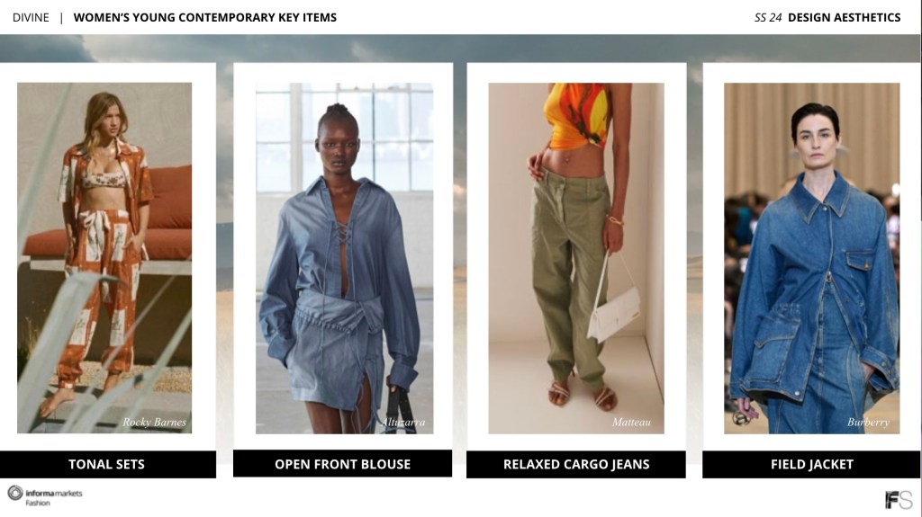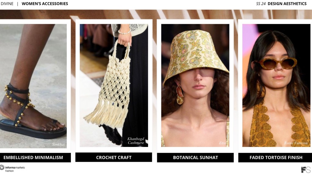Bohemian is the driving force behind this aesthetic of divine, consumers are finding solutions to modern shapes and crafts, but they are honoring themselves by honoring refinement, paying tribute to traditions of the past, adult contemporary plays out in maxi dresses, knit crochet sweaters despite it being spring, denim maxi skirt which is a first for denim as it honors refinement, and deconstructed blazer that’s open to upper body aesthetic; young contemporary lays out tonal sets for both tops and bottoms, open front blouses away from bottom-down or typical tops, relaxed cargo jeans that restricts the cargo pants idea, and field jacket where denim’s granted flexibility; accessories are finding innovation to making minimal more of a statement with embellished, crochet craft, botanical sunhat, and faded tortoise finish with sunglasses.