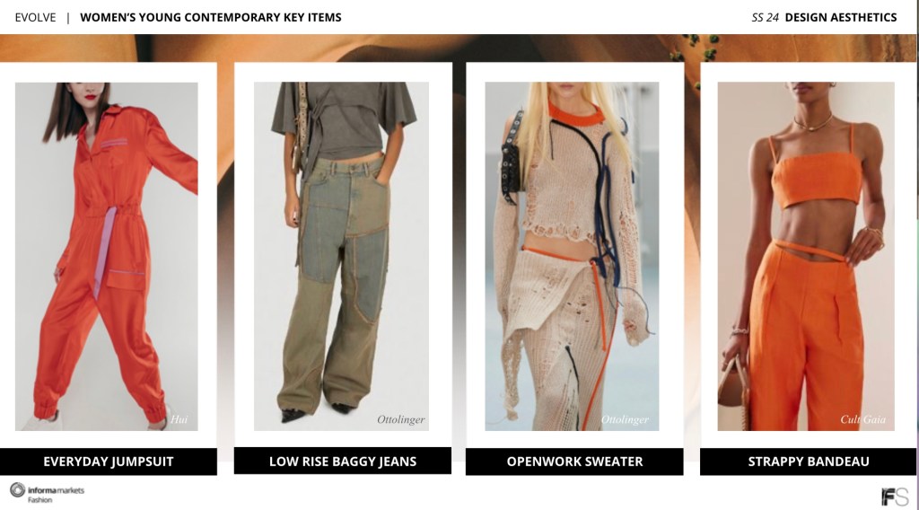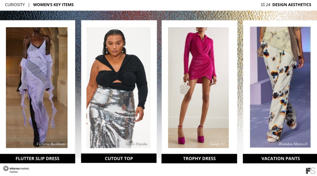 From all the cuts of fabric we buy to stay trendy, the biggest thing that you can do to be hip now is to do the opposite of social media norms, don’t update as much, but escape into digital fantasies or pop culture like “Bridgerton” which is evident in young contemporary bustier tops, the curiosity aesthetic drives us out of the need to post every 2 minutes and into revealing fantasy moments when we’re ready to, taking us back to the good ole internet days of the 90’s which GEN Z loves to live and retreat back to pre iPhone days, women’s contemporary falls into flutter slip dress, cutout top, trophy dress, and vacation pants, swing down to the young contemporary with bustier tops, ruched dress, strappy crop tops, and low rise mini-skirt, and accessories model this curious escape with strappy cutout shoes, color impact on handbags, molded heart sets, and inflated aviator sunglasses.