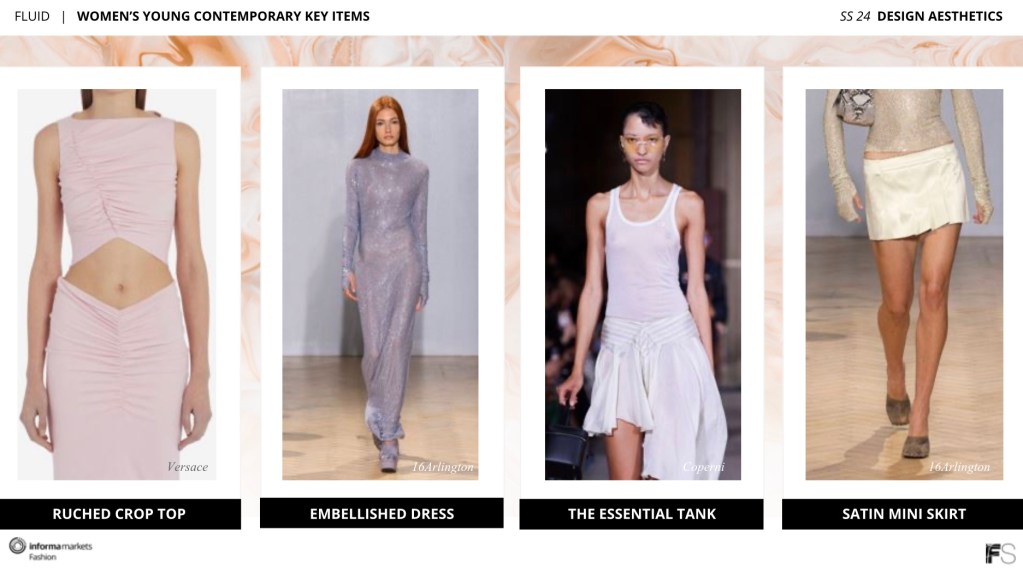 The funny thing about this next aesthetic of fluid is that it’s not what you’ve learned about fluid so far, fluid here means living a softer life about connecting to your physical and emotional health, and turning away from jaded pessimism in favor of a life of nature to find yourself once again, the fluidity to restore our performance by stepping away from things that weigh us down, silhouettes are apparent in denim column skirt while sheer plays a big role in column knit dress and sheer top, young contemporary lands on ruched crop top, embellished dress as mermaid core, essential tank as fluid, and satin mini skirt to keep mini in style without school girl, and accessories are softened with hazy eyed platforms, Y2K influences of pleated baguette bag, cat-eye squared in iridescent frames, and fluidity jewelry worn by glass drop lariat.