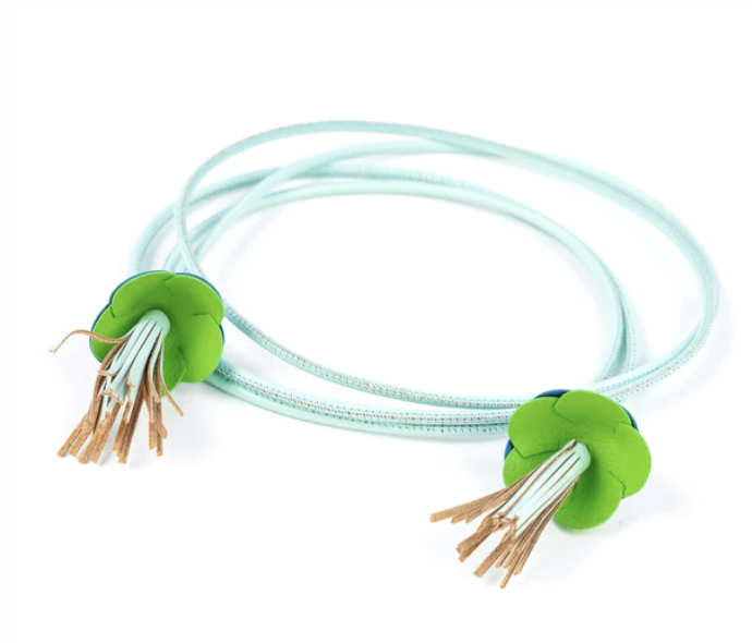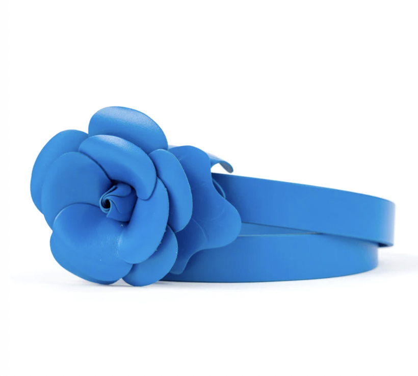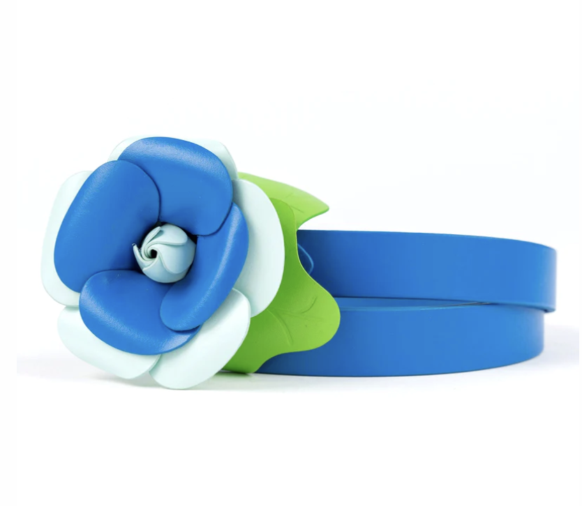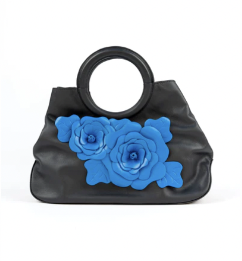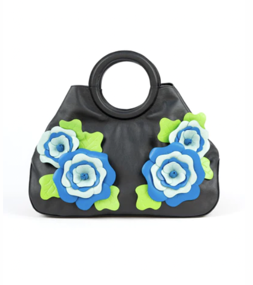 Floral appliques have been dominating the runways this year. Add this rosette trend to your wardrobe with a statement belt or top handle bag embellished in pretty 3D blue and green florals.