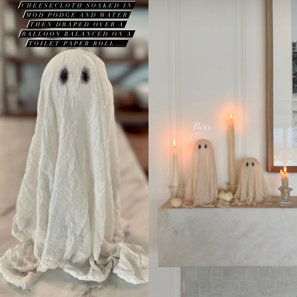 Ahead of Halloween, Lauren was able to achieve the impossible, Lauren got her cheesecloth created ghost to float, after being soaked in mod podge and water, Lauren relied on the power of helium by simply taking a balloon, placing it under Lauren’s homemade ghost, and the ghost transitioned from fantasy to real life, rising to be on display not only for Instagram Story, but also for Lauren’s mantle with lit candles and a twin to go with Lauren’s creative Halloween decor.