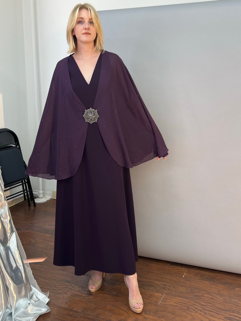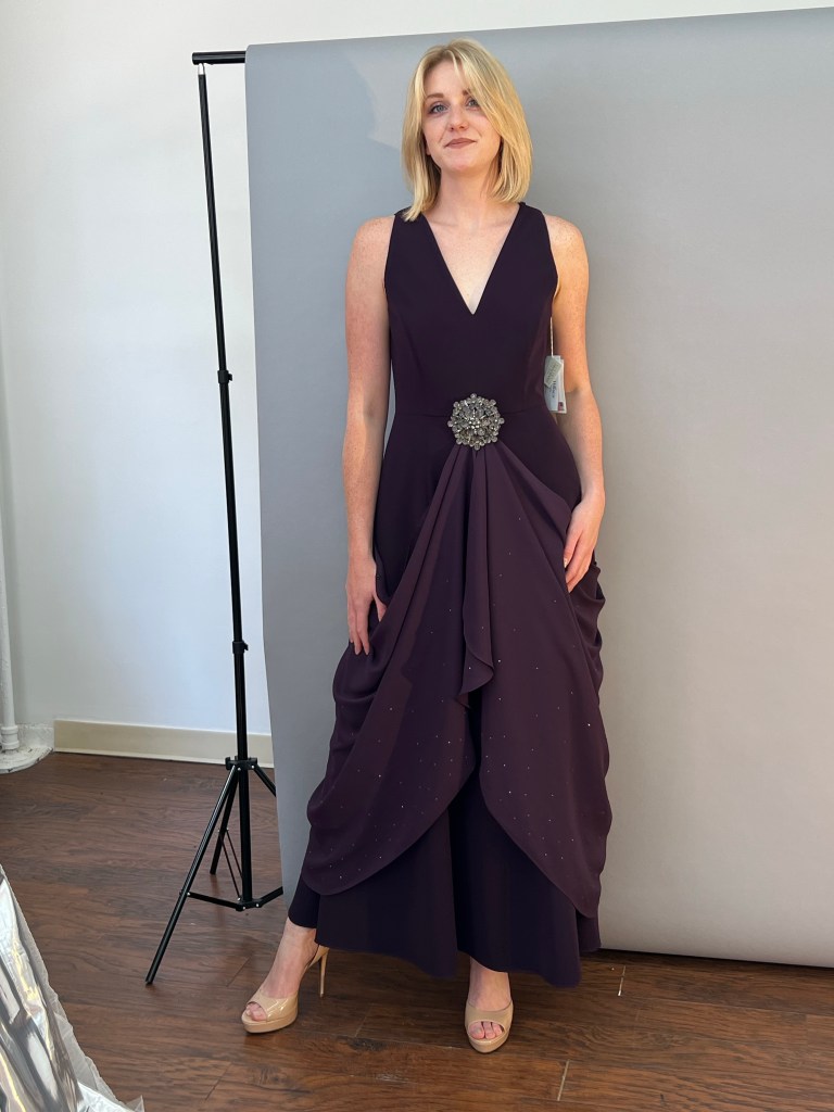 Shaws and the color of egg plant are 2 great things by themselves no matter how they’re used, but combining them together with this Evan Hirsch transitional gown are one of the best fashion combinations you’ll ever find, the first effect is a semi-triangle dress where opaque pieces are creating an illusion of a bell gown, then the Shaw comes off and turns into ruffle detail where egg plant stands out in a reception hall of bright colors in this tank transitional gown, plus the belt hardware detail that dominates in both gown variations.