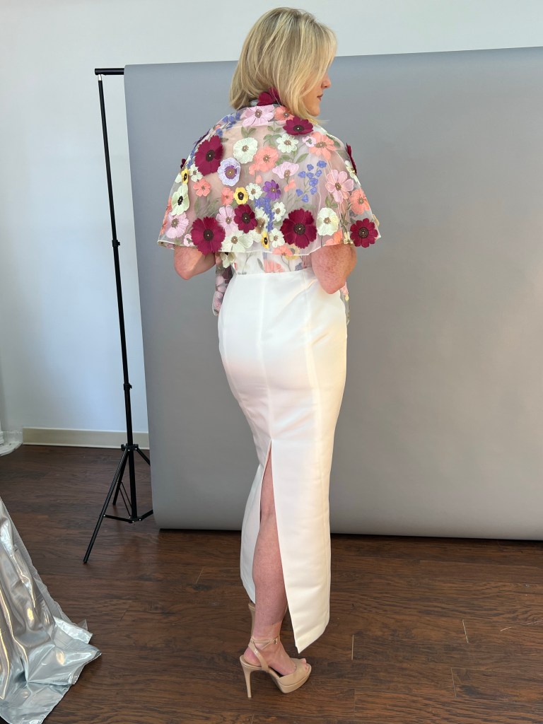 Now let’s go in reverse, Evan Hirsch takes florals and starts them as a dangling torso companion where florals dominate the top portion of this truly white canvas gown that fits into wedding color form and function, but to keep the florals dominant, florals climb up to the shoulders to become a tiny blazer of flowers that add back florals to what becomes 100 percent flower detail on the top.