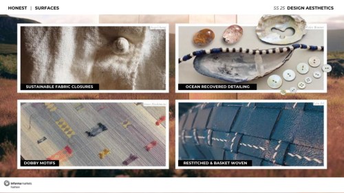 Materials include slubbed & mouline shirtings of broadcloth fabrics for knits and cooling aspects, sustainable cactus & agave cropped leathers that are apparently plant-based and cleaner aesthetics for items such as jackets, skirts, and handbags, faded denims deemed as sandy & soft plus cottonized hemp which all potentially absorbing knit offerings; surfaces involve crafts with modern aesthetics, sustainable alternatives to metals and plastics include sustainable fabric closures for button-down shirts, ocean recovered detailing also are viable closing materials to make buttons, dobby motifs form subtle patterns, and restricted & basket woven can be incorporated with stiff leather raffia fibers to create stitch compositions.