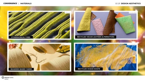 Materials sourced out of plant life and sea life include the leafy option of otherworldly ribs found on natural greens, seaweed based yarns confirmed and perfected out of labs, recycled vegan leather alternatives generally offered on apparel and accessories found on original animal leather, and recycled ocean waste collected to create cool and crisp options like swimwear naturally connecting to sea life plus activewear; surfaces are bio-based sequins which were made to be illuminated, psychedelic digital prints for hyper-physical product outcomes, air-filled protection used as cushioning for footwear, and chromatic weafs to heighten the rugged look that’s denim into a high-definition experience.