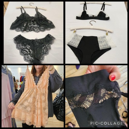 Baby doll bra and matching thong, silk stretch charmeuse chemises and tea gowns that can be worn as a dress to go out in at night. Tailored pajamas with matching robes. Knit loungewear in soft modal fabric, and camisoles with built in bras,