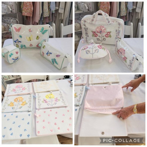 She has created travel lingerie envelopes just to carry your bras and panties in so they don’t get dirty touching your clothing in your suitcase. The travel envelopes are machine embroidered in soft pastel colors on white pique fabric on both sides. The fabric is stain resistant and you can spot clean it with laundry detergent and water. They are lined in poly satin throughout the bag. The lining matches the trim color. Size is 12.5″ X 9.5″ and priced at $95.00 Zip closure on the inside and the flap snaps shut so you can be assured that your underwear doesn’t fall out.