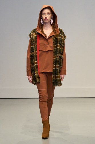 While many looks garnered significant reactions from her enthusiastic audience, it was the jumpsuit and full-length maxi gown covered in cargo pockets of all shapes and sizes that truly were the showstoppers. The pieces were both constructed in a scuba knit printed in the sesaon’s trademark peach and khaki tones. The print was taken from a painting the designer recently completed of the Wailing Wall in Jerusalem. Other colors in the diverse palette included mustard yellow, deep teal green, lavender, mint green, olive, and terra cotta.