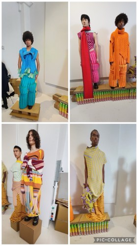 A collection of sweaters that are artistic in bold bright colors. The theme of presention was the “Garbage Collection” and it was designed by Beam Ratchapol Ngaongam who I interviewed. The knits are knitted by hand and then machine stitched into a cut and sew sweater in China. The designer’s concept was to create a sweater that has never been done before and that he certinaly did. The turquoise sweater with the tassels in the upper left hand corner of the photo was made sustainable by using recyced plastic in the yarn. The rest of the sweaters were made with merino wool. As a fashion industry expert I like to feel the fabrics and these sweaters were very thick and of the highest quailty. Some pieces are on size fits all and others S/M/L. The sweaters retail from $450.00 – $1,000.00. To shop WWW.BULANNEWYORK.COM.