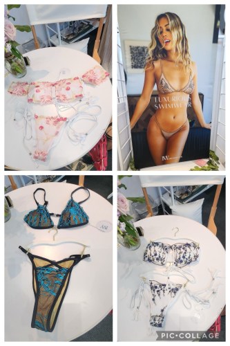Lace swimwear that is lined, applique embellished and meant to be worn in or out of the water. One of the styles I thought was very practical was the off the shoulder style with removable sleeves for the water and to go out at night you can put the sleeves back on (see the upper left-hand side of the of the photo). Top styles are triangle bra with push up removable pads and has a center front clasp to fasten , strapless, halter, and off the shoulder. Bras are adjustable with sliders to make it tighter or looser. One of the cute bottoms has a gathered seam up the back that enhances a smaller butt. Notice the side strings in my photo that adjust to make the bottom go higher or lower.