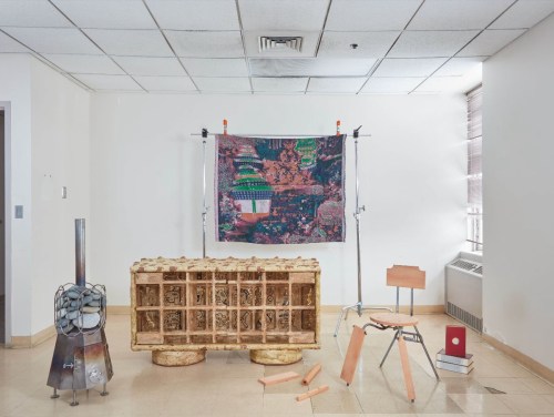 A prompt to recontextualize the ordinary and find surprise in the unexpected, Objects May Shift is a curious and critical exploration of how our world and the ways that we inhabit it are changing. From graphic design to art, furniture and textiles, the exhibition foregrounds creative flux and transgresses disciplinary tradition. A variable typeface is scaled to excess, skewed and outlined; an upholstered seat inflates to become a wall; a cabinet is made from a dresser; and a woven Jacquard tapestry pairs AI-generated imagery with images of wealth, hoarding and trash. The exhibition is as imaginative and optimistic as it is sobering. Objects May Shift is a collaborative proposition that asks us to think boldly, to see more than what meets the eye and, perhaps most poignantly, to consider what may be.