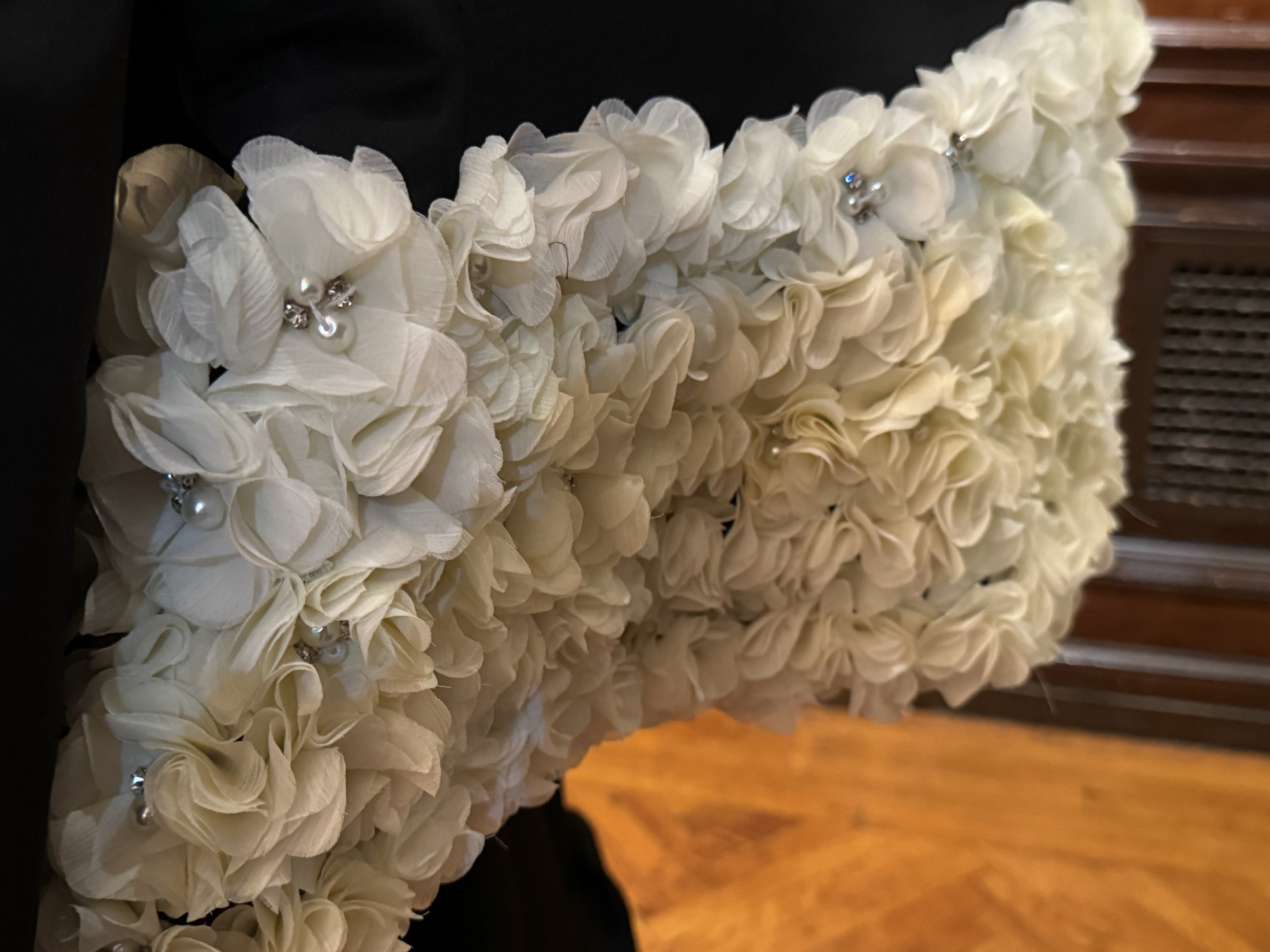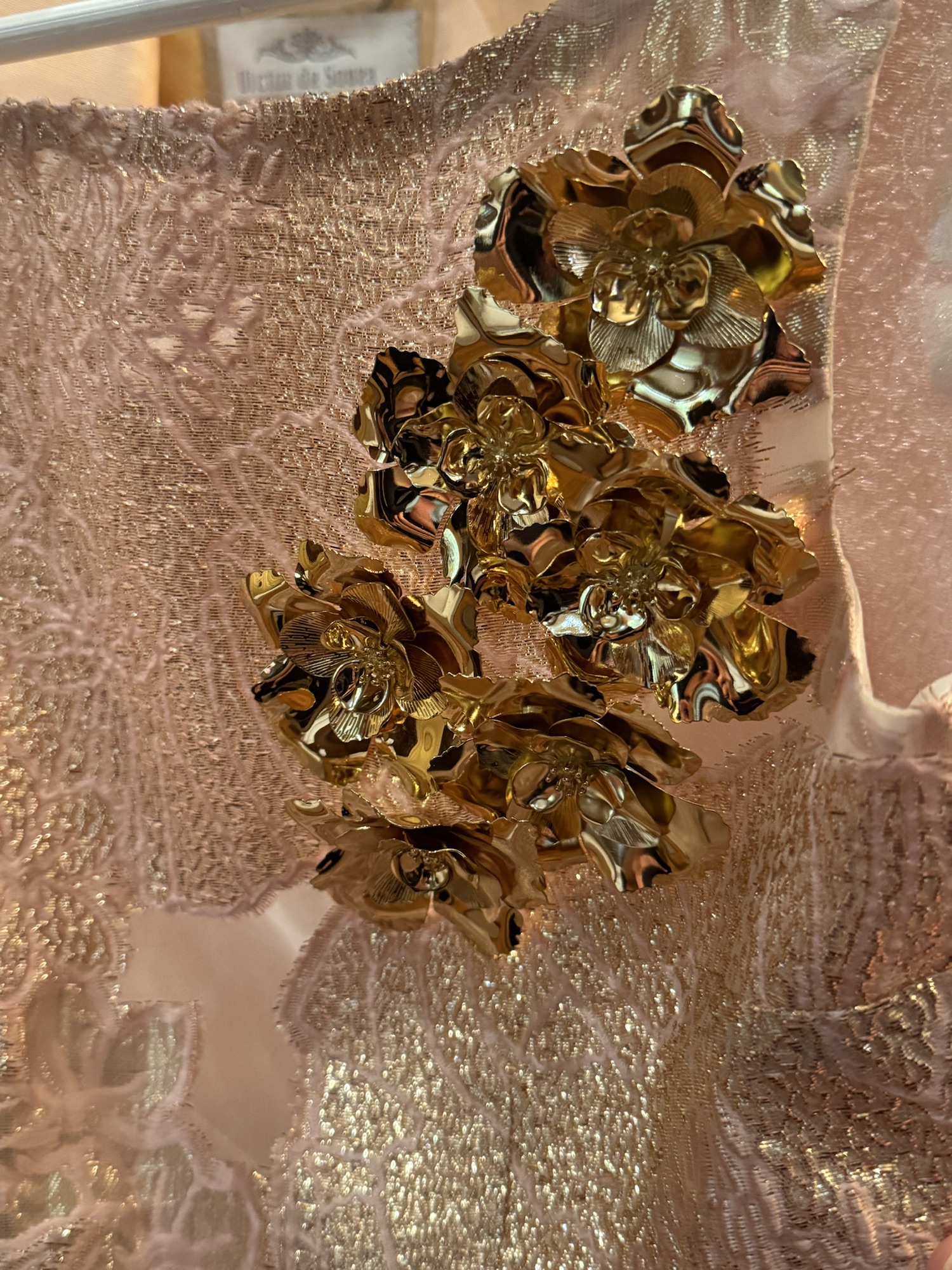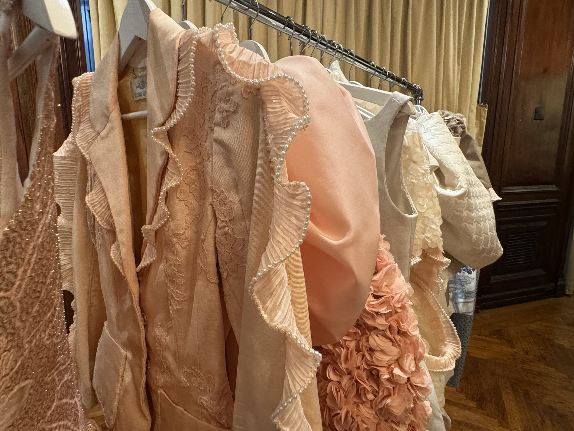 Detailing is the most-important aspect of every item when designing a garment of any kind. It’s not only Victor’s fall and winter 2024/ 2025 collection that’s here at the Argentinian Consulate, it’s also spring and summer of this year, 2024. Beads and lace are lined up in beautiful motion on peach colored blazers in wavy and vine-like fashion to honor the type of detail material involved. The most notable with Victor De Souza SS 2024 is one of his dresses are made up of the flower that’s organza, lined up inside with borax, and organza shaped carefully to hold strong as a garment. On this spring collection, the most shining moment at the top image before this paragraph is the metallic gold flower that Victor De Souza designed and uniquely shaped himself, one part of this flower was given to DANIEL PLUS LAUREN.
