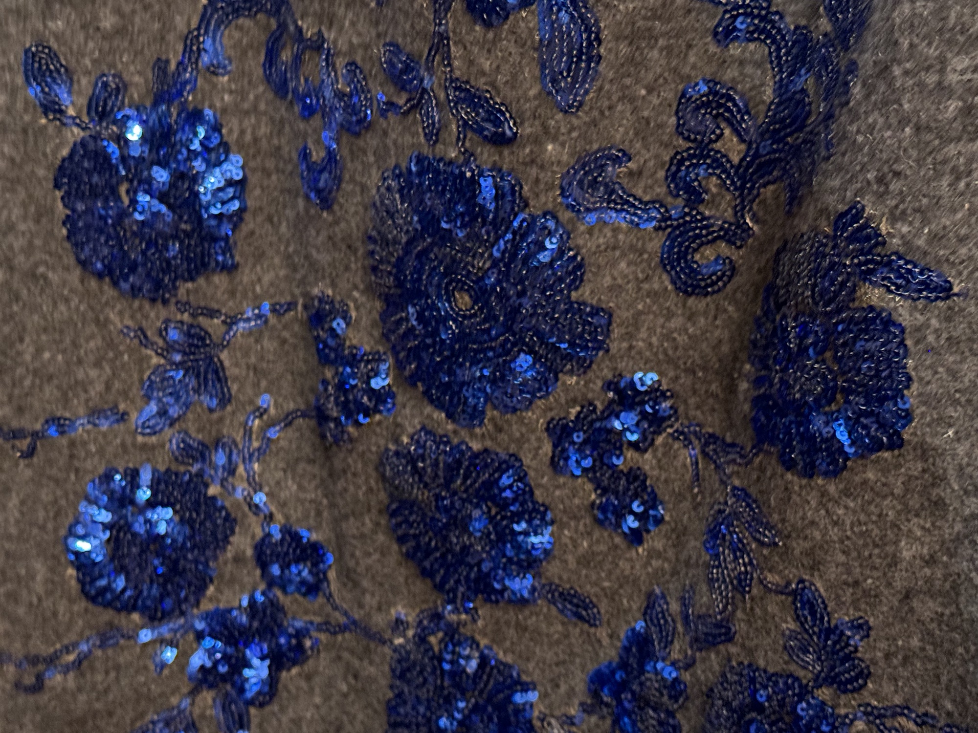 On this high quality heavy yarn dress you would admire the details of the wide open silhouette. This time, Victor De Souza adds contrasting blue metallic detailing to gray texture. The lovely floral patterns in royal blue are lined like a vine with pops of floral bulbs blooming with leaves poking out the vine like design. Not only do you see lovely reflecting tiny disks of blue make up each flower, you also see spotlights of blended silver looped into leaves patterns and even bigger flower blooms as you drive along this bulky silhouette gray inspiring metallic detail.