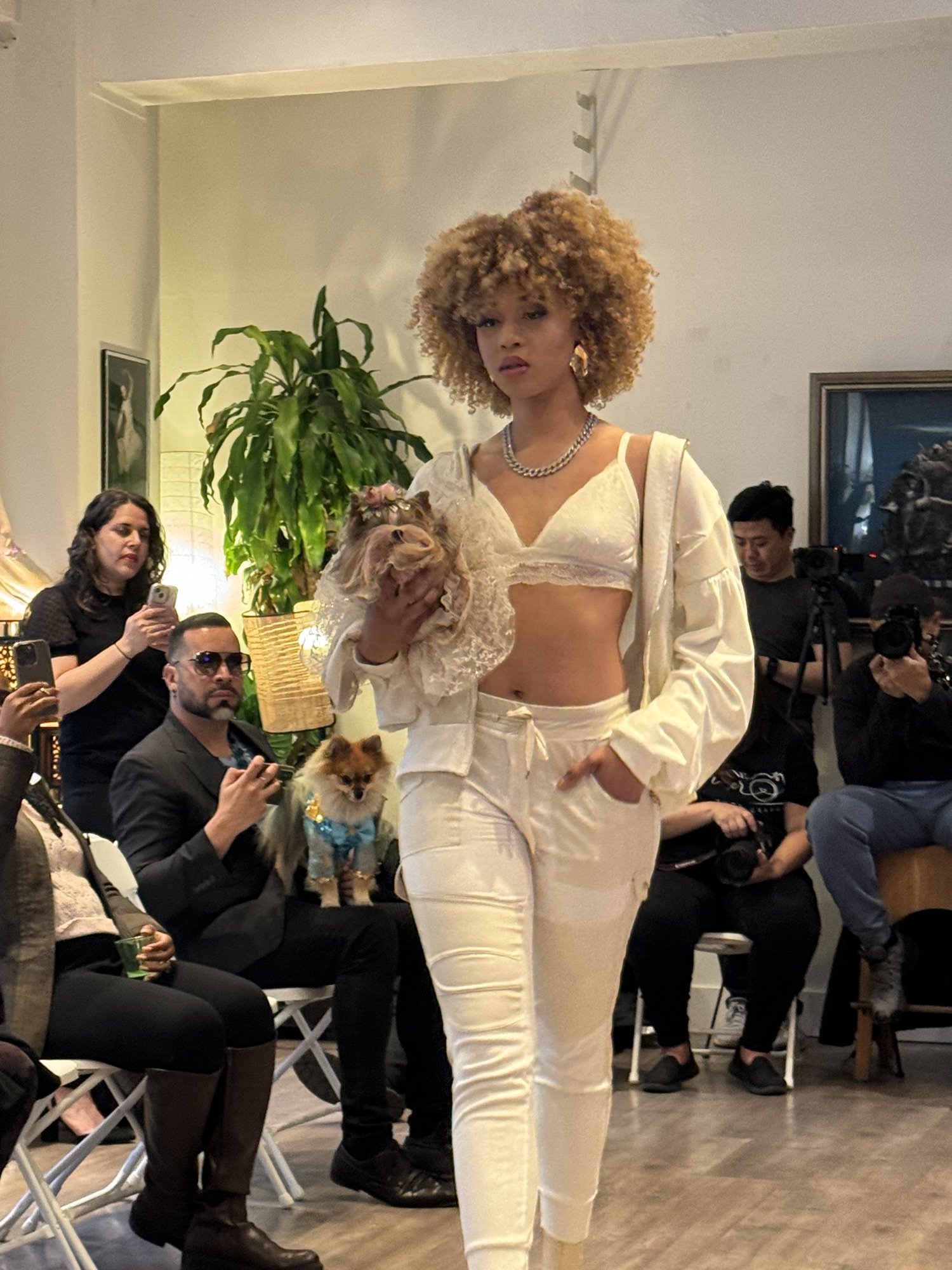 The Funari Collection created by Janelle Funari, had a special runway presentation tonight at TAL STUDIOS here in New York City. Funari took the alluring appeal of her Funari Paris spring 2024 collection for a special cause to benefit PAWS NYC. Funari brought together all 3 collections currently out this spring season, the dog park collection, couture, and lingerie. The dog park collection and the spring couture collection mirror each other in perfect alignment with matching looks cater for woman and dog.