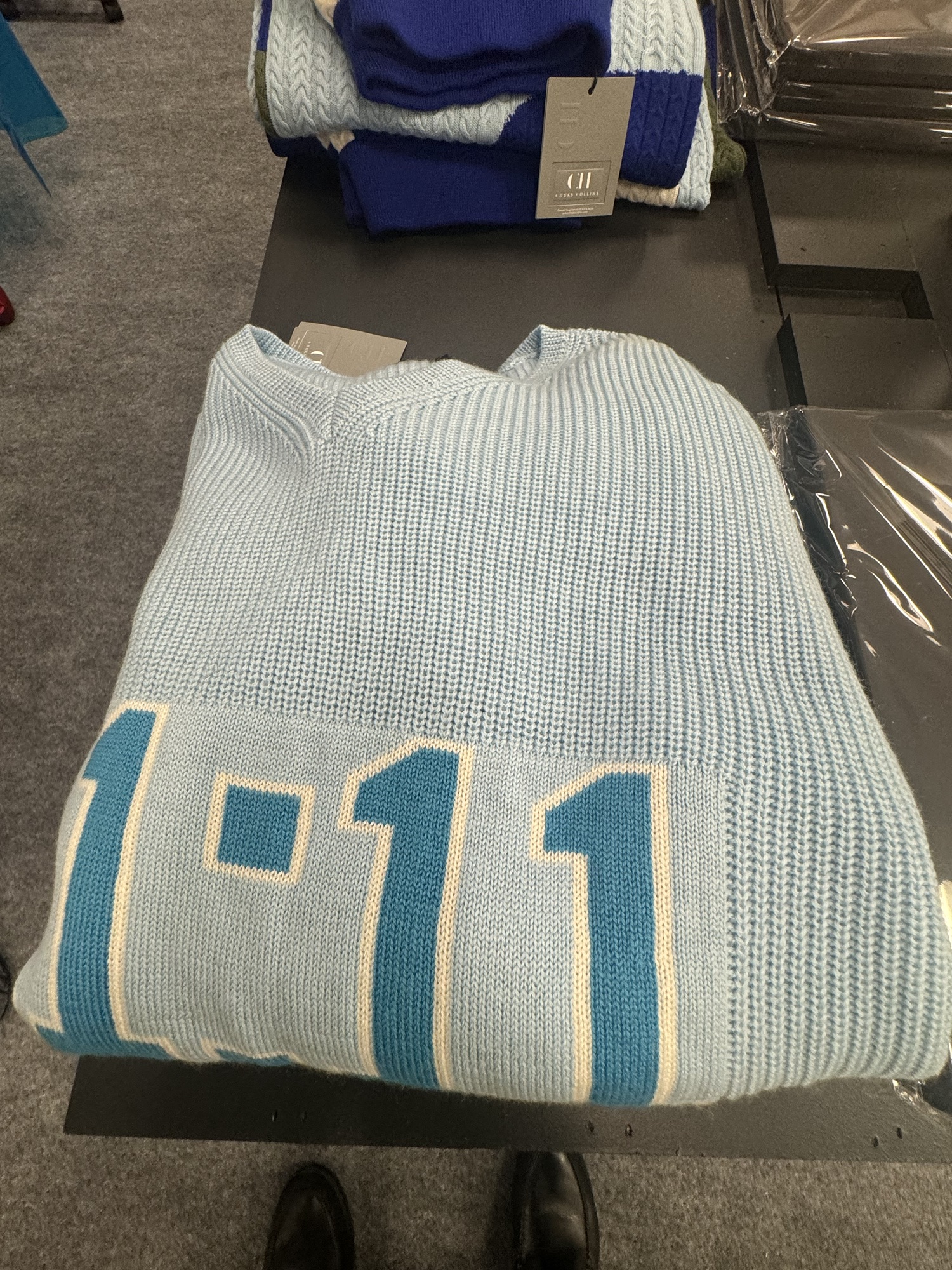 Shades of blue are all too obvious where they came from, beautiful ocean blue exist on “1111” pieces such as “Eva”, a knit oversized V-Neck sweater with elbow sleeves made up of sustainable cotton. It’s a hand-knit piece designed to exude Chuks Collins path to greatness. You can also pair “Eva” with “Luka” knit flare lounge pants also made exactly like “Eva”. These sea life print pants are unique vertical strip to replicate a coral reef in warm tropical waters.