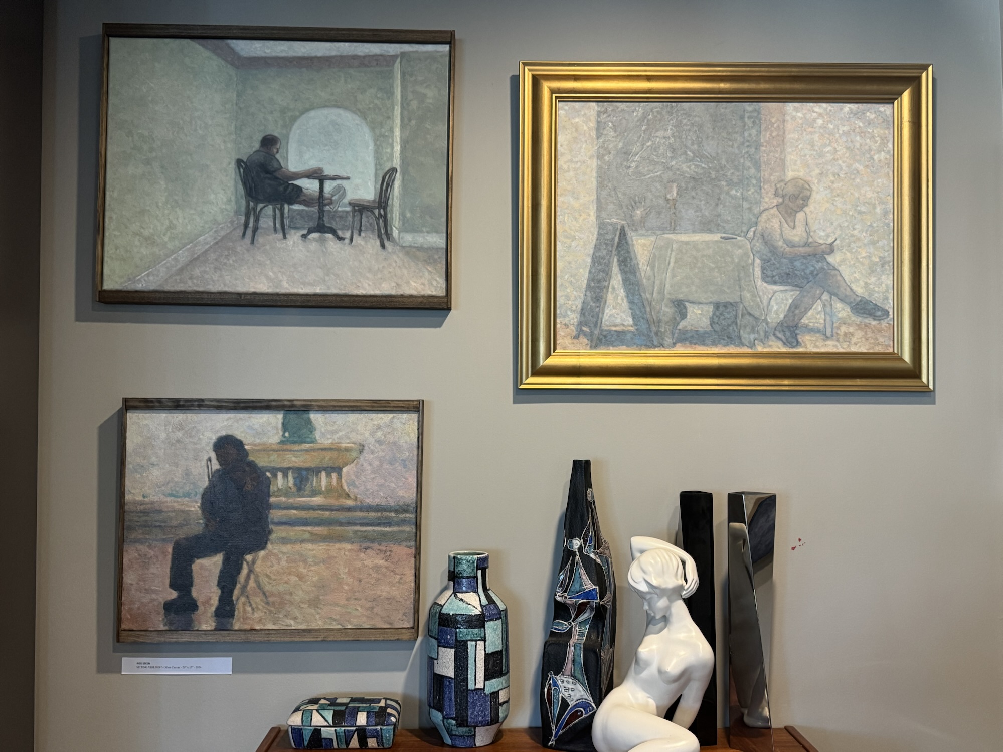 You can’t possibly sit without internal emotions running through your body about a time where you sit outside, and look back and forward. Rick Secen uses his oils and acrylics to sit figures outside in distant places so individuals see near and far the past and the future. Traditional reflection are what’s at play here with works such as “Distant Bridge”, “Sitting Violinist”, and “Beauty & Essex”. A lovely blue sky or an embolden empty room where you are at peace for one, but also see where else you can go in your life.