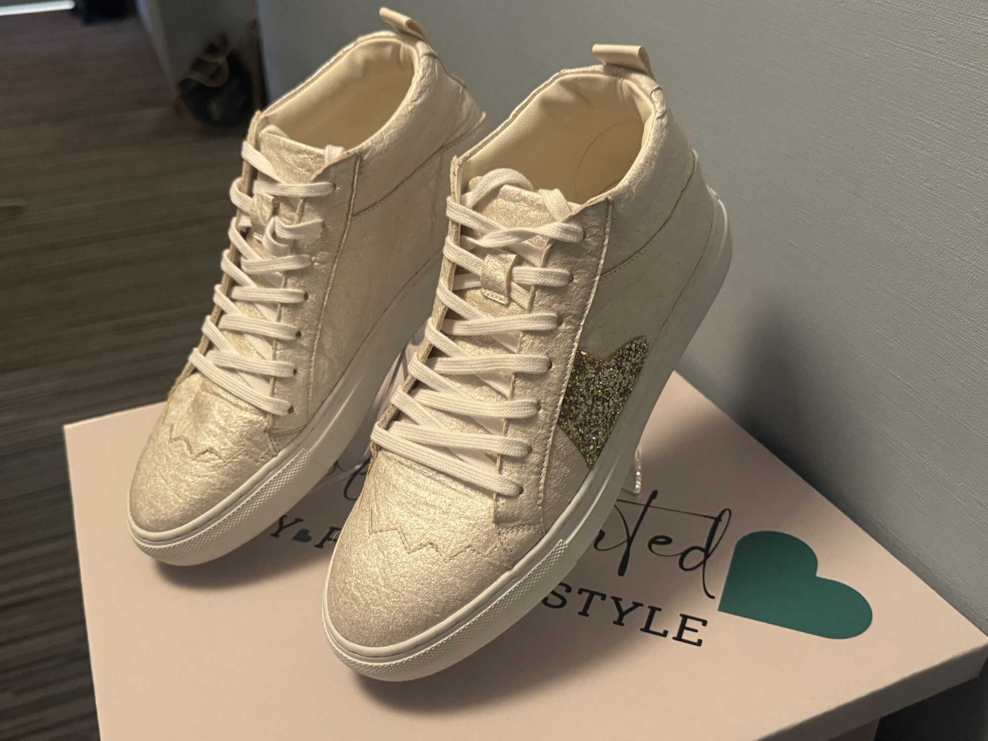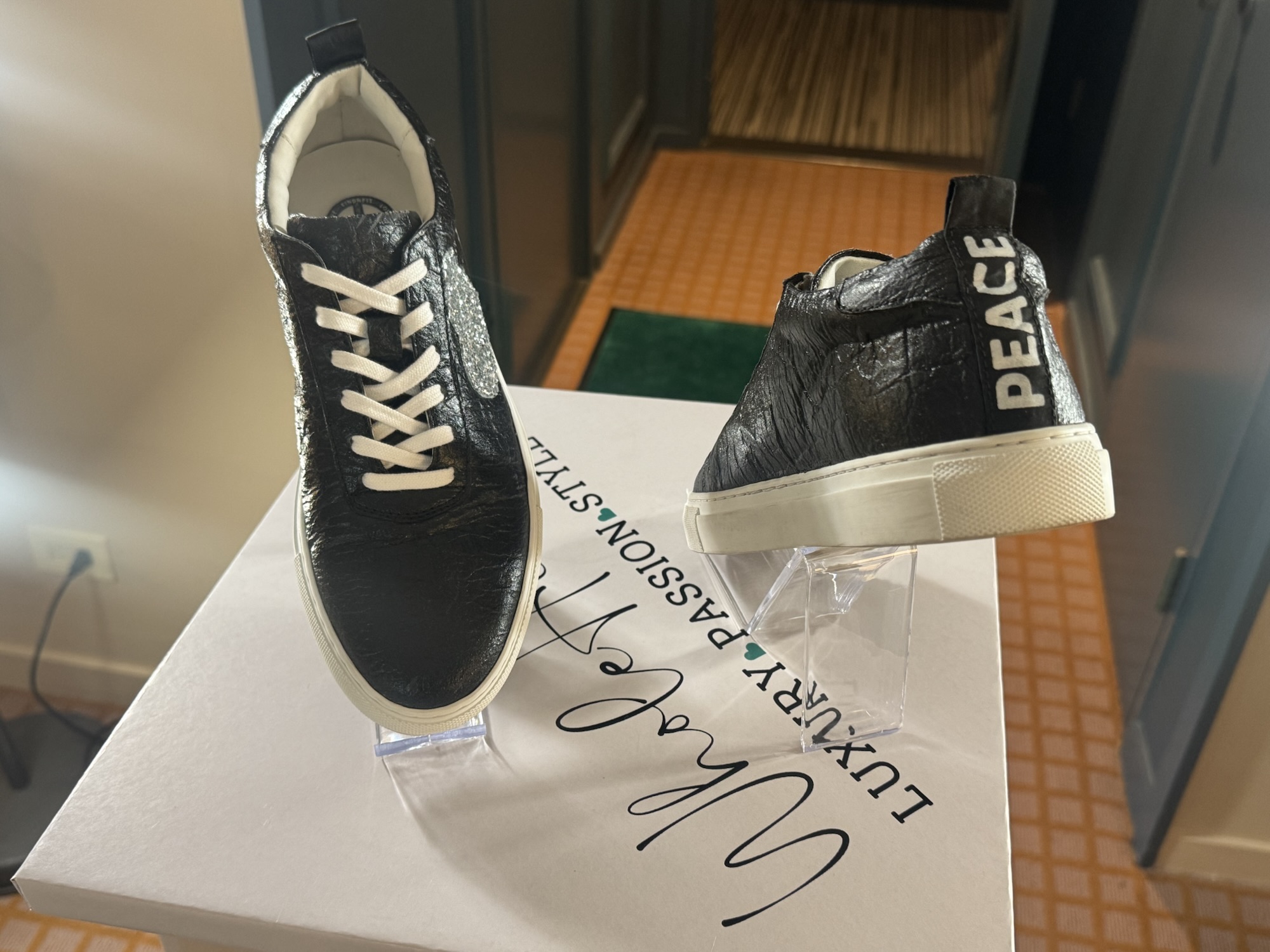 Silver sparkly hearts are the unofficial logo and slogan on all of Wholehearted Shoes made up of pineapple skin. In these fun canvas sneakers in your choice of black and white, you get to see the rigid and refined finish of pineapple skin shine from a mile away. Plus, take note of the powerful words like PEACE and WORTHY on the back of each shoe. At play here are the wonders of sustainability found in the fruits of nature combined with a simple fun sneaker that’s easy on the feet with words to live by.