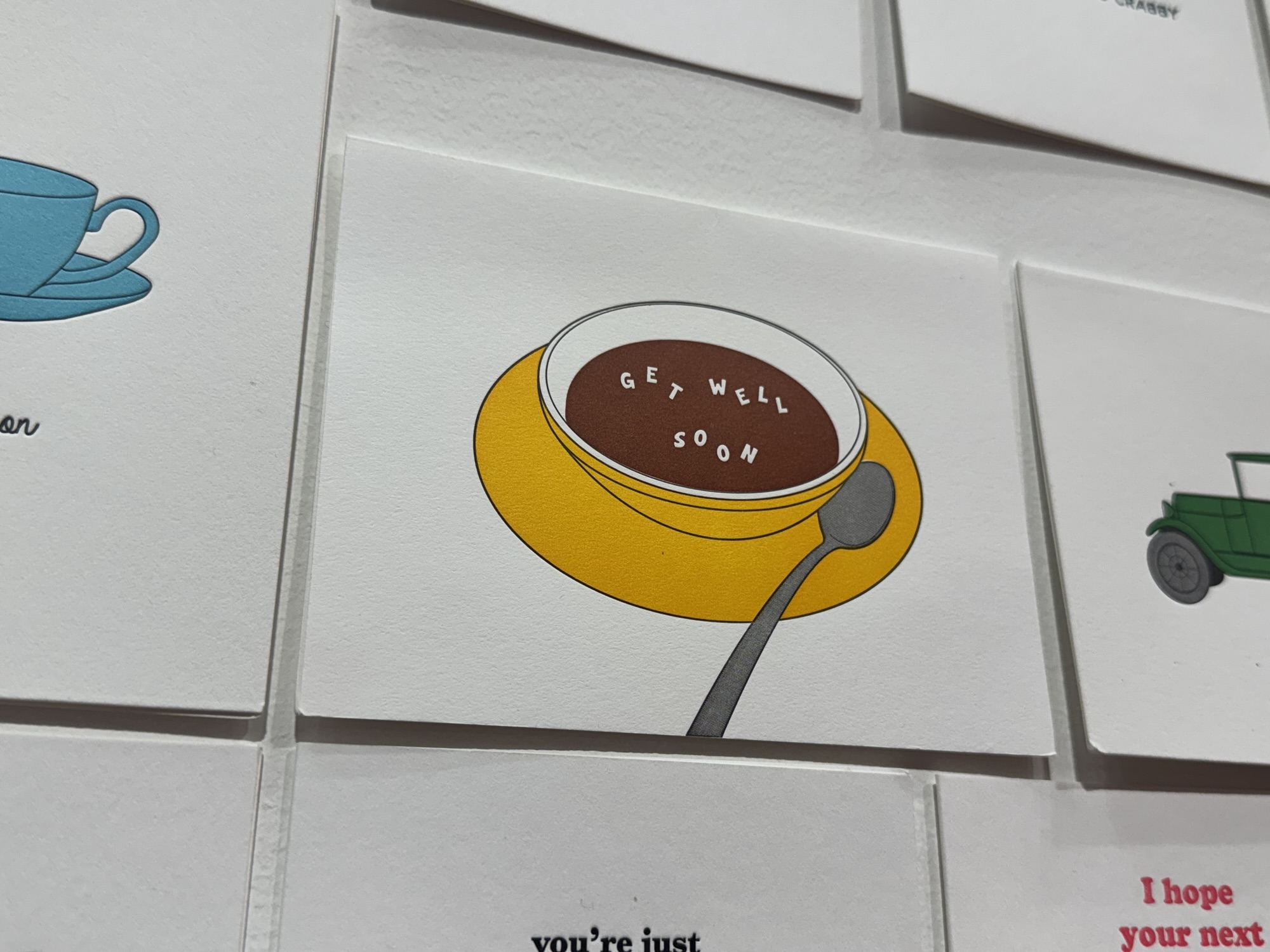 The simple phrase of “You’re Beautiful” with a greeting card and a magnet becomes 3 ole school coffee pots. Then comes the words that will change it all, “you’re brew-tiful”, everyday kinds word twisted into a witty meal of laughter out of items you never thought of. There’s also those meaningful phrases that don’t change their words around to be clever, they’re just paired up with what’s happening in the room at hand. “Get Well Soon” stays as it is, to give those wishful words even more depth, call in alphabet soup, and spell out “GET WELL SOON” in your soup bowl.