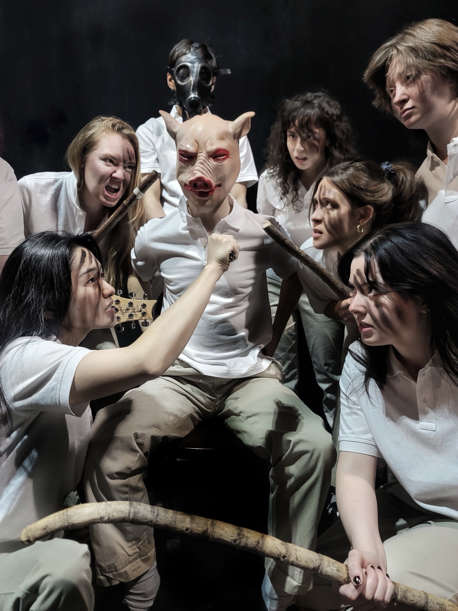 PROD. TEAM: Lighting by Alexander Bartenieff, Costumes/Props – Susan Hemley, Pig Masks – Susan Kaplow, Stage Manager – Ally Clare, Props Coordinator – Grace Andringa, Make-up & Graphics – Sofia Zucker, Tech Direction – Mark Marcante, Board Operator – Geoffrey Christopher