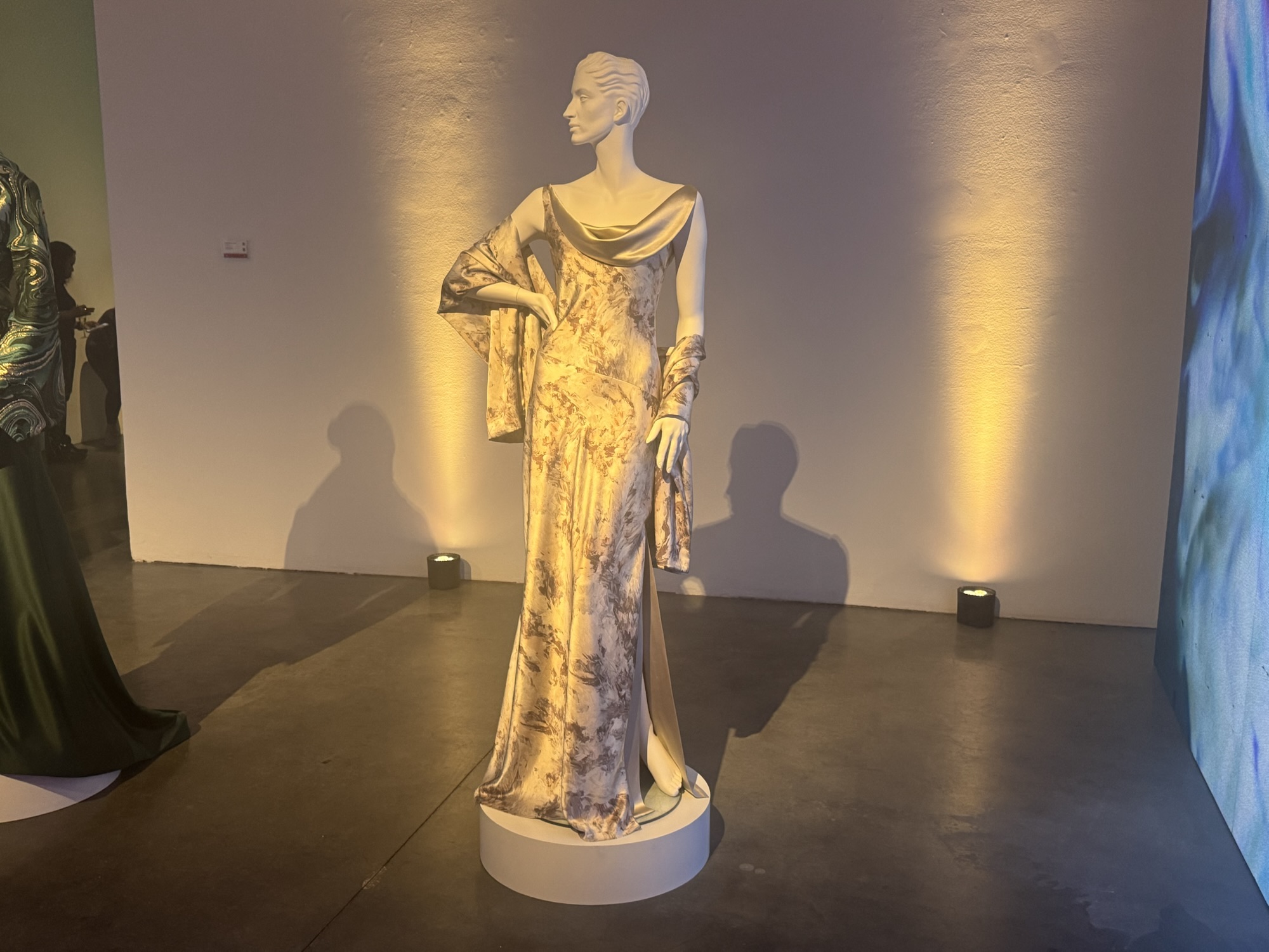 Kevan Hall pays tribute to a late and great legend in the music industry, her name is Whitney Houston. Kevan celebrates with the Whitney Gown who wore Kevan’s gown back in 2003. This signature pattern includes a bias cut with an asymmetrical cowl neckline. And in fall 2025, Kevan features a Suminagashi inspired print in alabaster and taupe, illustrating the timeless beauty of Hall’s heritage collection.