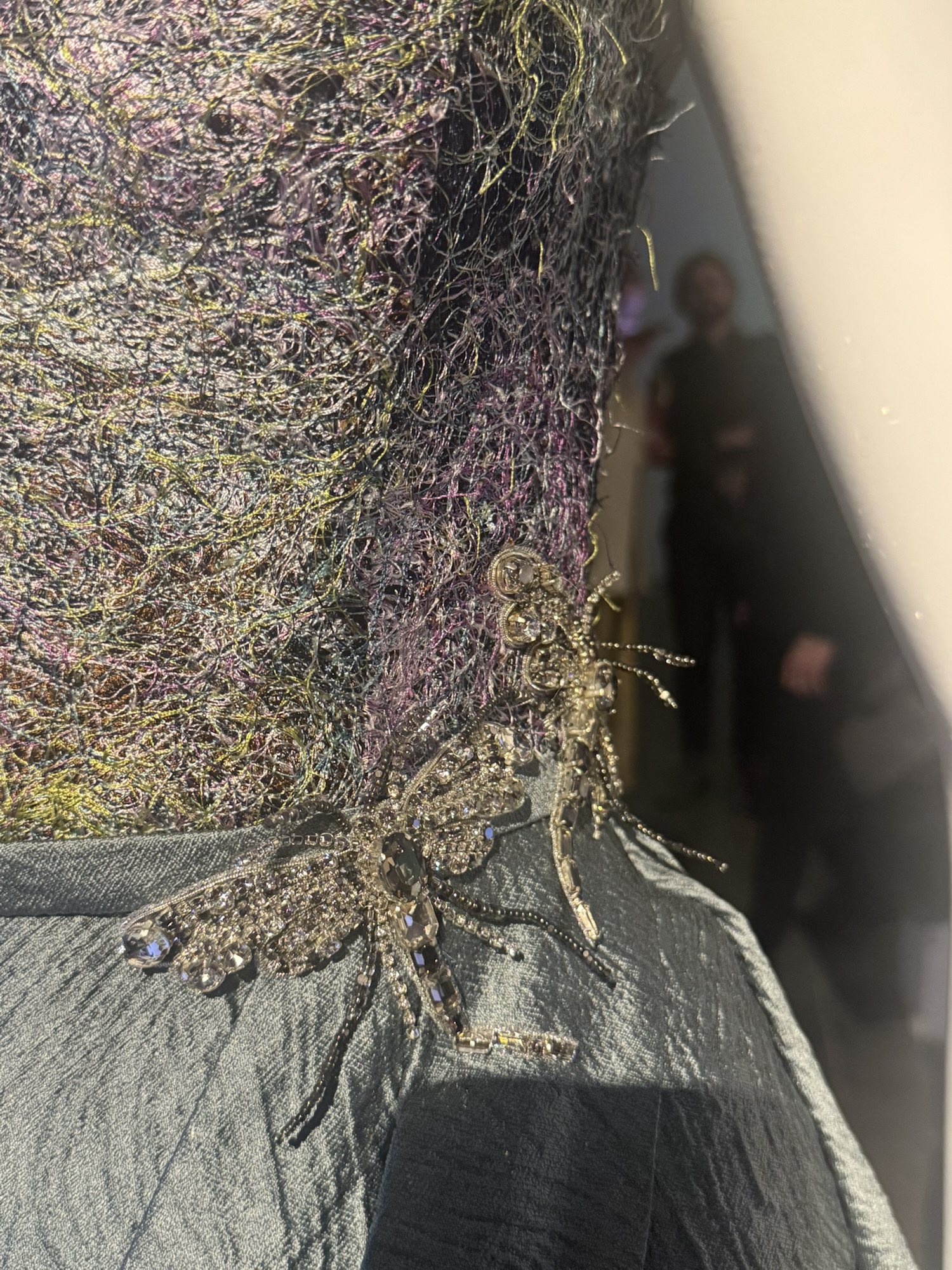 Going across the aisle with last night’s Kevan Hall FW25 presentation, we come across Suminagashi. It’s the art of liquid marbling, where flowing ink and fluid hand movements create mesmerizing patterns. Kevan creates these Japanese techniques of mobile and movable patterns through Colored Threads, this décolleté gown paired with a textured taffeta skirt, crafted from thousands of yards of cotton thread in a spectrum of colors. One thing to note with this gown is the butterfly molded stitching taking place while aligning with metallic yarns and jewels. Movable patterns end result also takes place through the Malachite Ensemble that’s a sculpted jacket crafted from Suminagashi-inspired brocade with gold accents, paired with a malachite crescent neckline bustier.