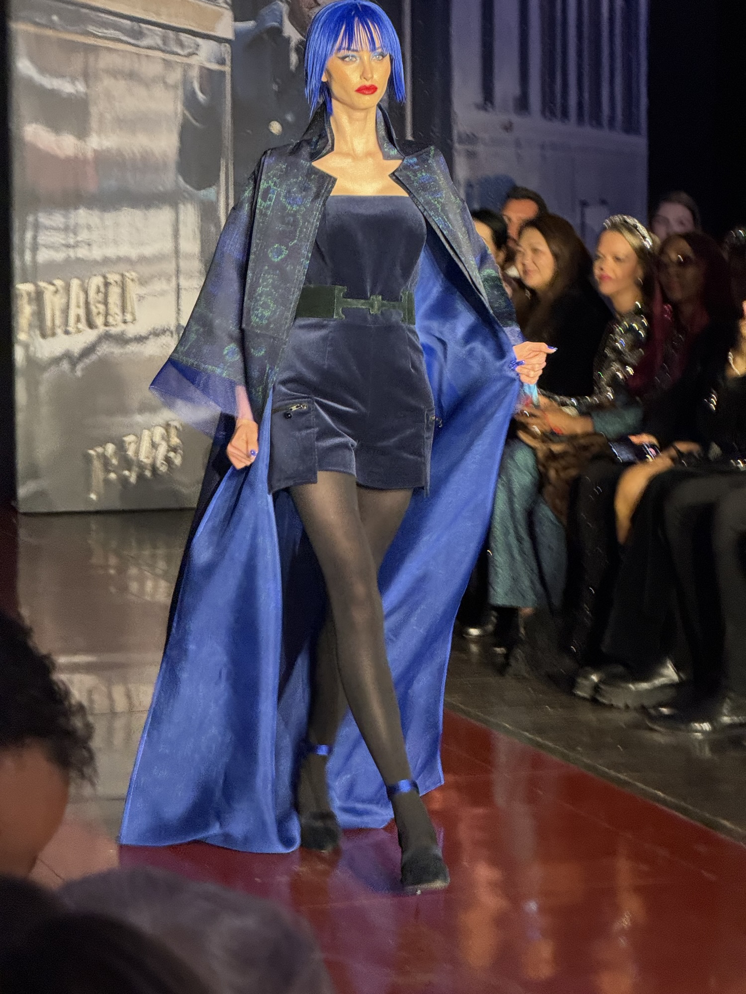 The day scene was about making a grand entrance onto the Orient Express in beautiful suits, coats and dresses adorned with genuine fur and jewels. I loved his use of colors such as sapphire/navy/black mixed, emerald green and of course black. Luxury fabrics such as a water repellent silk faille fabric used in a peak lapel overcoat lined with carpet silk twill print that could be worn over suits, dresses and jumpsuits and if it rains unexpectedly you won’t have to worry that you will ruin the coat. The emerald mohair peak label overcoat had a hand -beaded Louis XV medallion on it to make it stand out from any other coat you will see strolling up and down Madison Avenue but practical enough to be worn in the daytime to keep you warm in winter.
