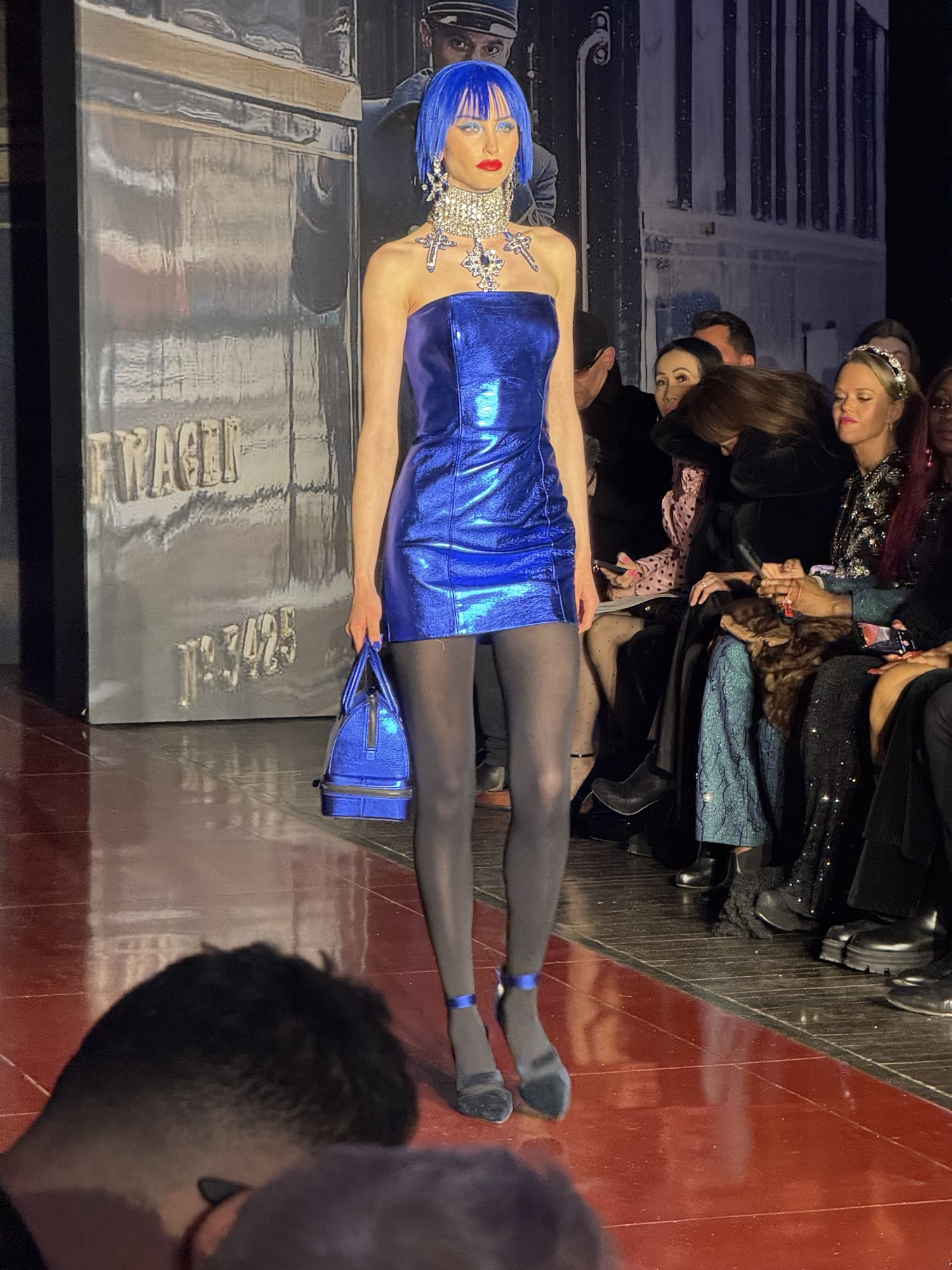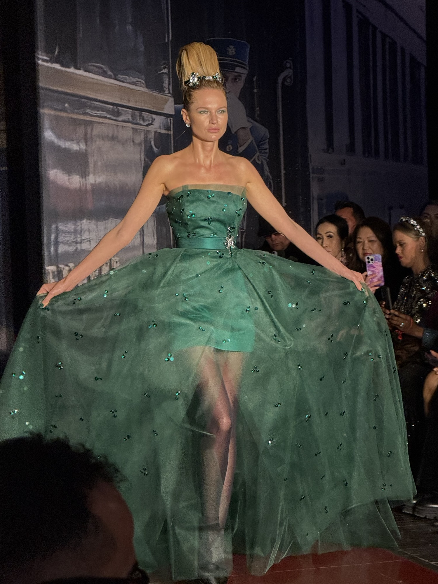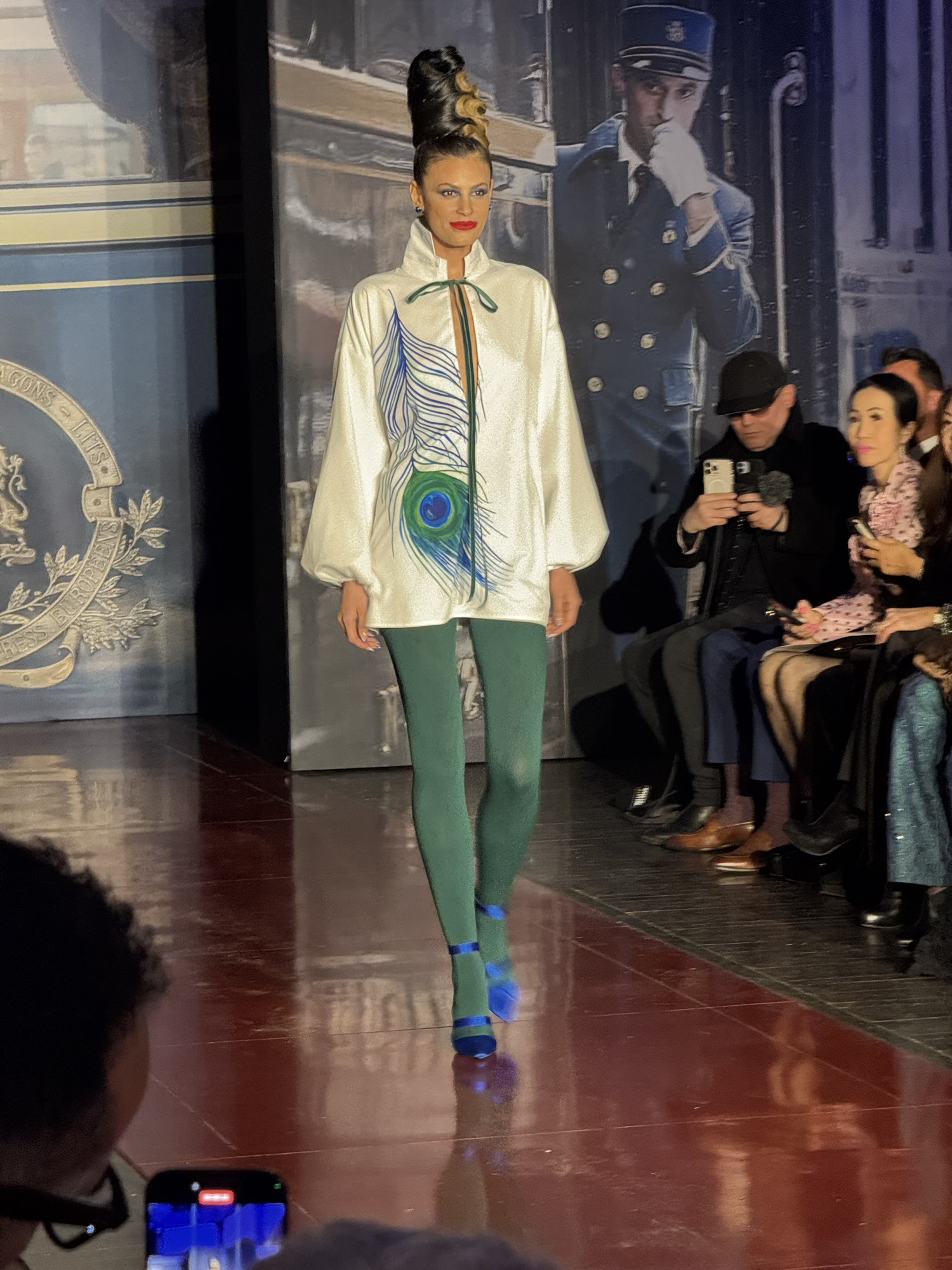 On the Orient Express New Years Eve Soiree Scene was about the Jet Setters mingling and flaunting their show stopping evening dress and glamorous gowns on the train. One of his show stopping looks was a royal genuine peacock feather and crepe print mini dress adorned with a peacock green ribbon bow. In another look, Zang used a multi strand diamond chocker with hand beaded sapphire and diamond crystal crosses on sapphire French metallic leather strapless mini dress that was so stunning and nothing like I’ve ever seen before.