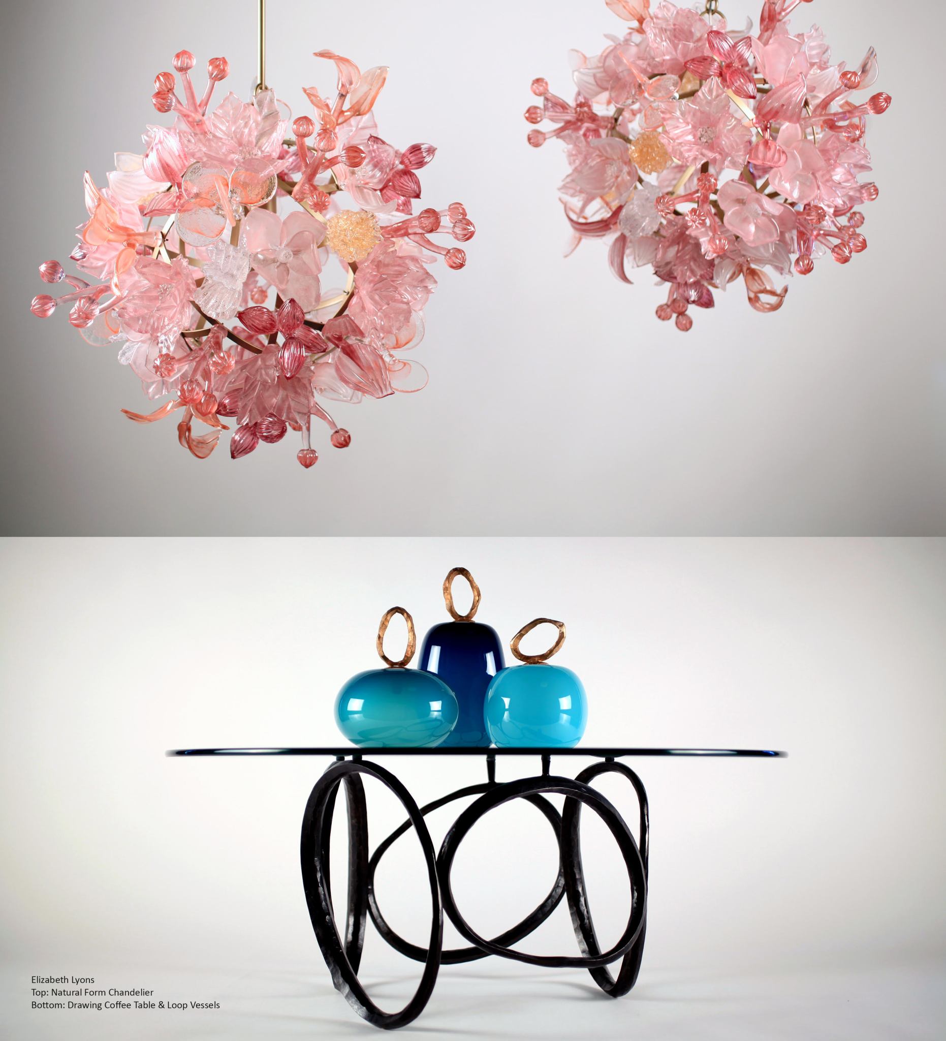 Blending fine art with functional design, the exhibit will include new sculptural chandeliers, glass vessels, tables, and wall pieces, using traditional glassblowing as well as metal casting and forging.