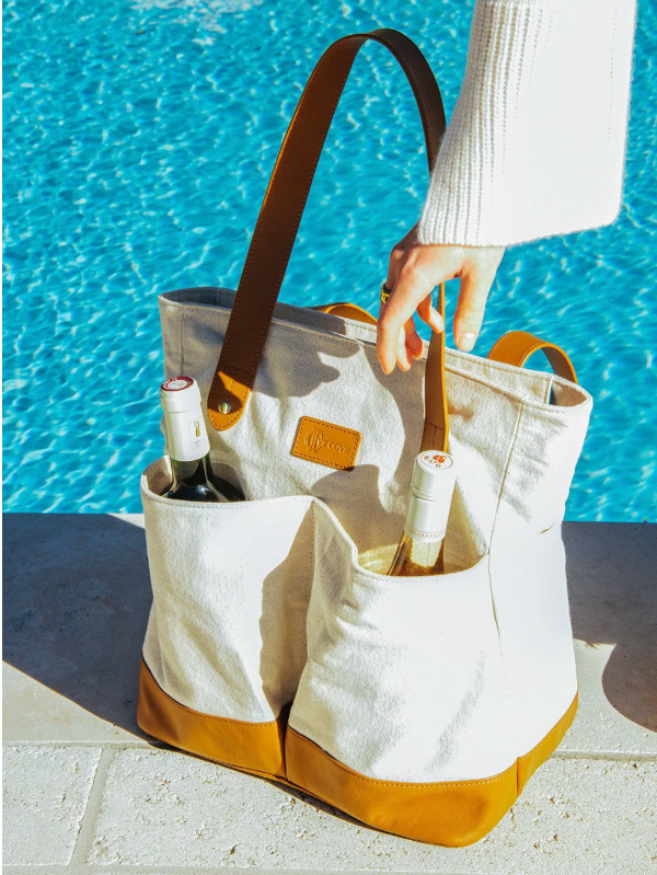 The Ivy Cove Ojai Wine Bottle Carrier Bag is an essential for anyone who enjoys a stroll along the beach, through the fields, or a light hike through the hills as a means to a wine picnic at the end! With room enough for 4 bottles, a blanket, and some knives and cheese, it will prove as useful as it does stylish. With leather handles and bottom, the bag can handle a little rough and tumble while aging beautifully over time. This version has a cooling lining to keep your food and drinks at the best temperature.