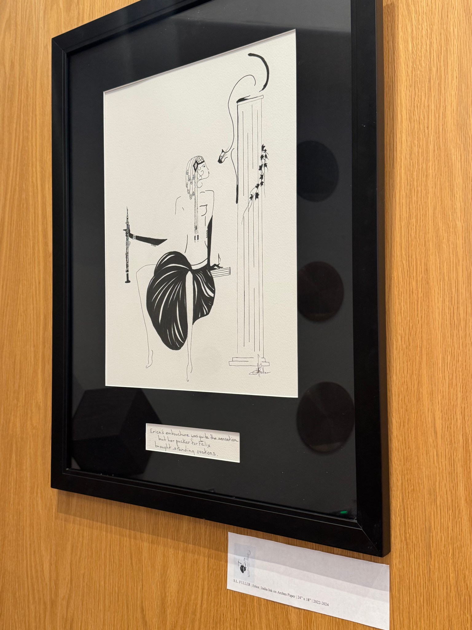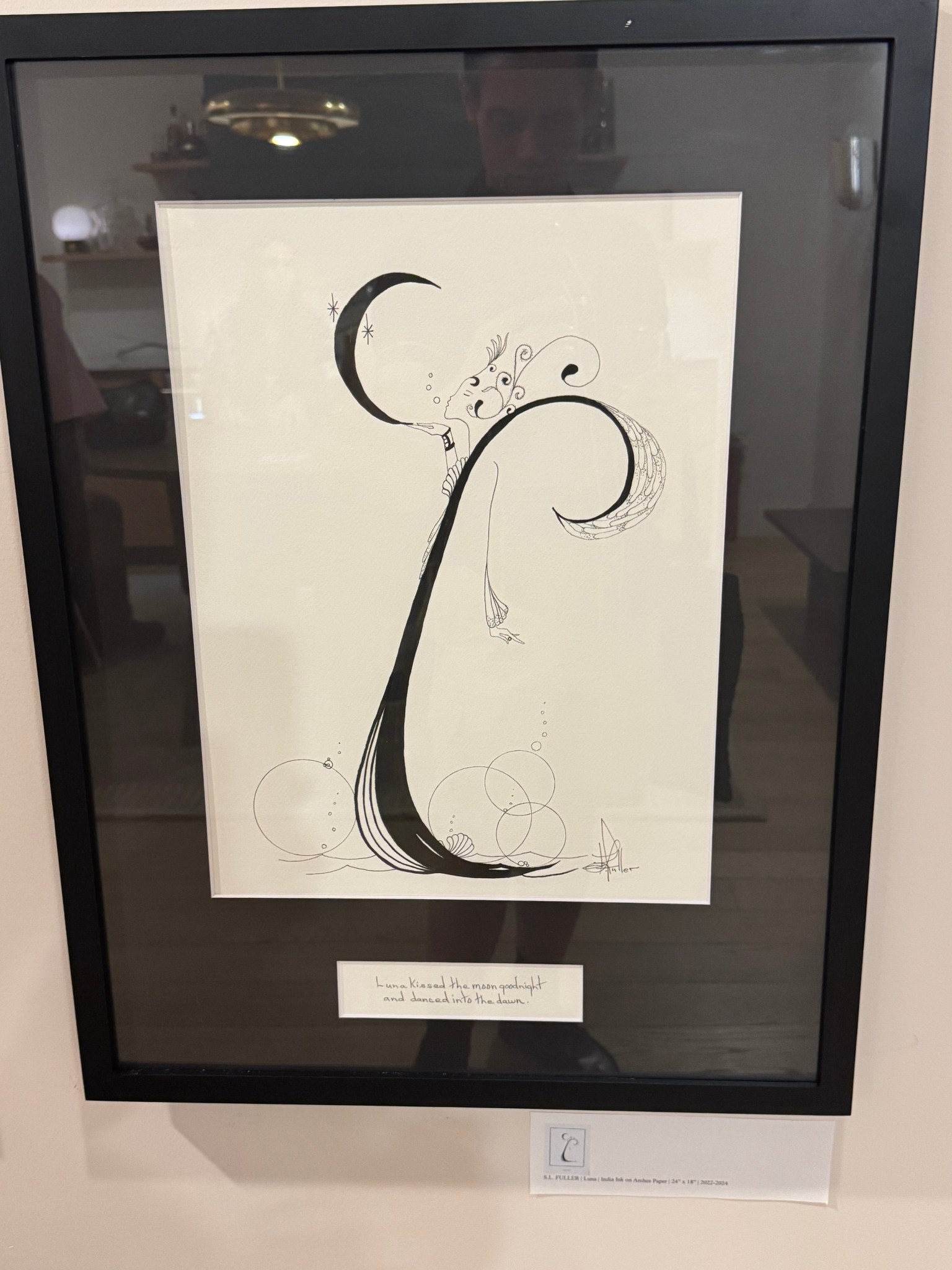 Ink is the only powerful means of writing you have to authenticate or tell a story about what took place, ink cannot be effectively used if it’s not applied on paper. At any given moment, S.L. Fuller lives in an elegant situation as Indian Ink on Arches Paper create “Erica” where this sleek illustration has Les Demoiselle kissing a feline while performing her musical instrument of choice, then came applause. Welcome to “Simone”, a musical tribute to S.L. Fuller where “Simone” plays the Saxophone in pure beautiful delight, but the only thing “Simone” admires here is her own silhouette. The celebration of ink and paper comes to life one more time with “Luna” falling in love with the moon as she blows a kiss and dances till dawn.