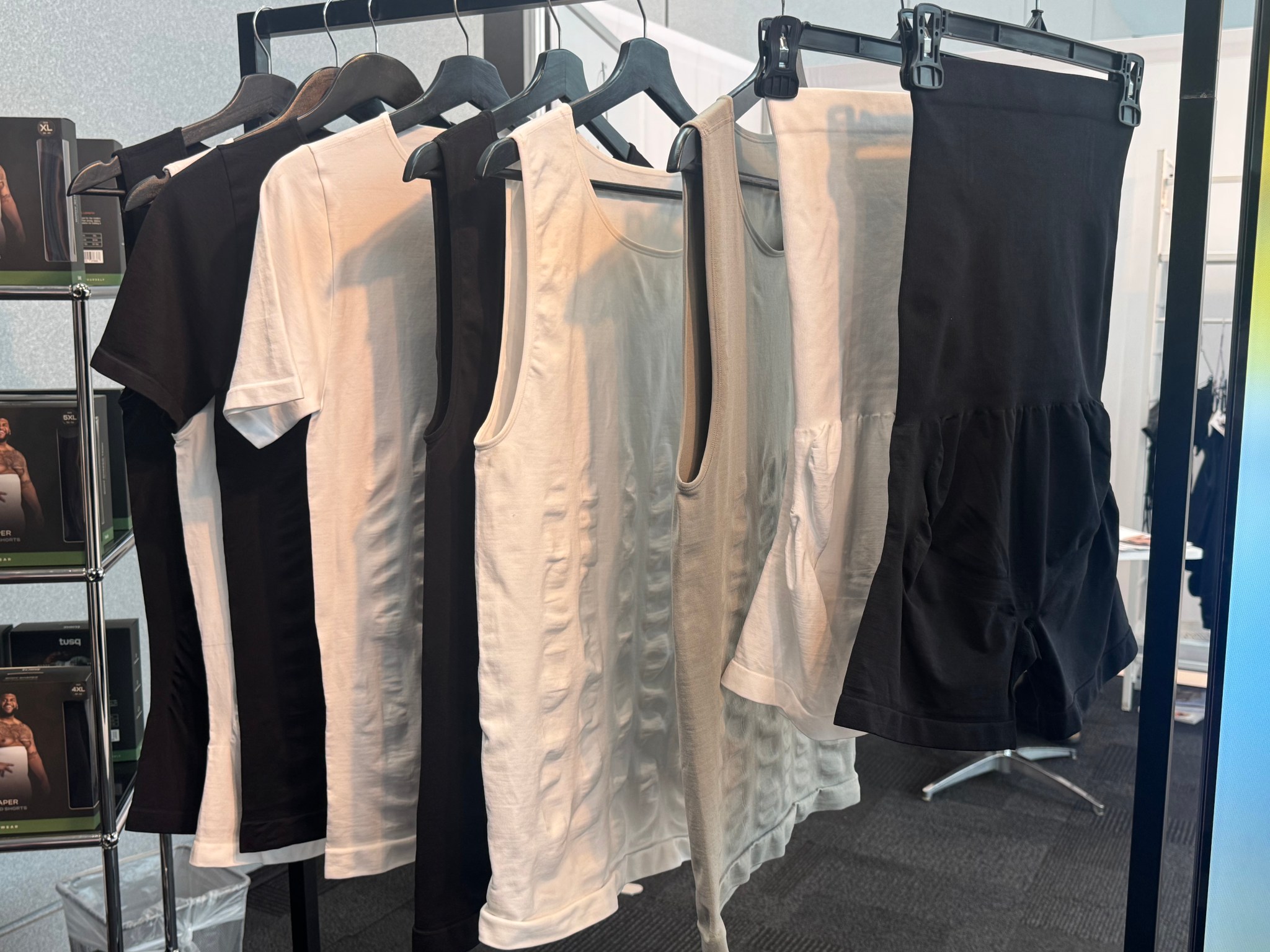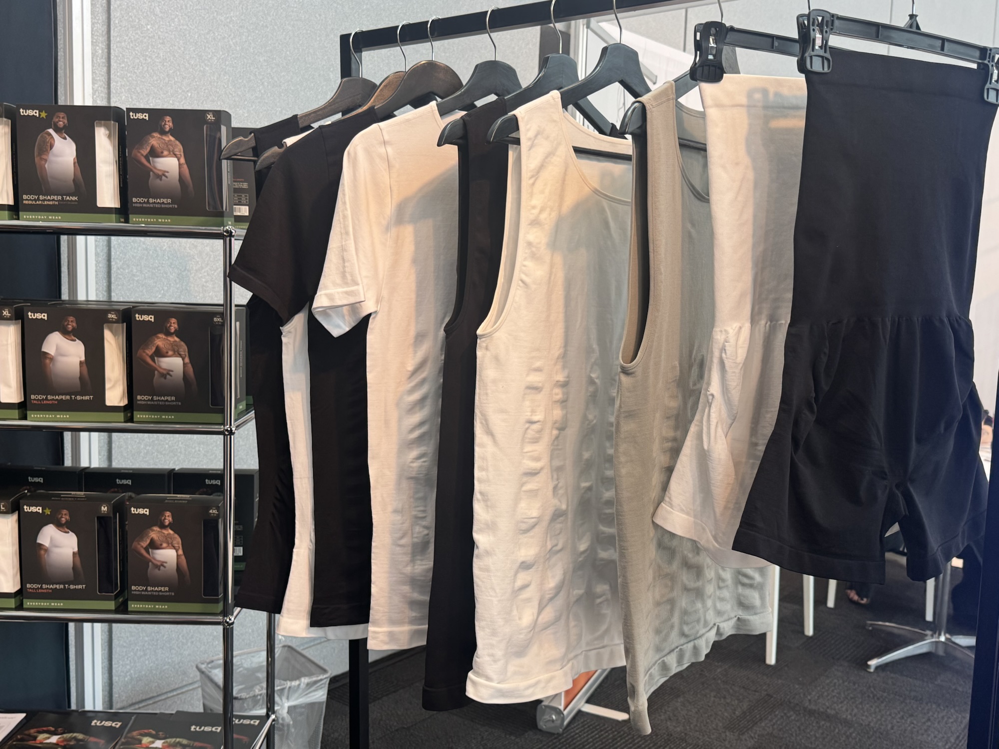 The 3rd and final day today at Curve New York is all about shoring up the fundamentals, and getting in a few more orders before Summer 2025 edition closes. It’s also one last opportunity for DANIEL PLUS LAUREN to visit vendors they’ve been meaning to see, or recommended. Also opening up our minds to learn what other sectors of the intimates industry are seeing growth, what consumers are now buying. Shapewear has seen success like no other, especially Men’s shapewear which has only had an 8 year lifespan up to now. One new brand here at Curve NY that’s out to ensure confidence in men’s shapewear and also launching as we speak is TUSQ.