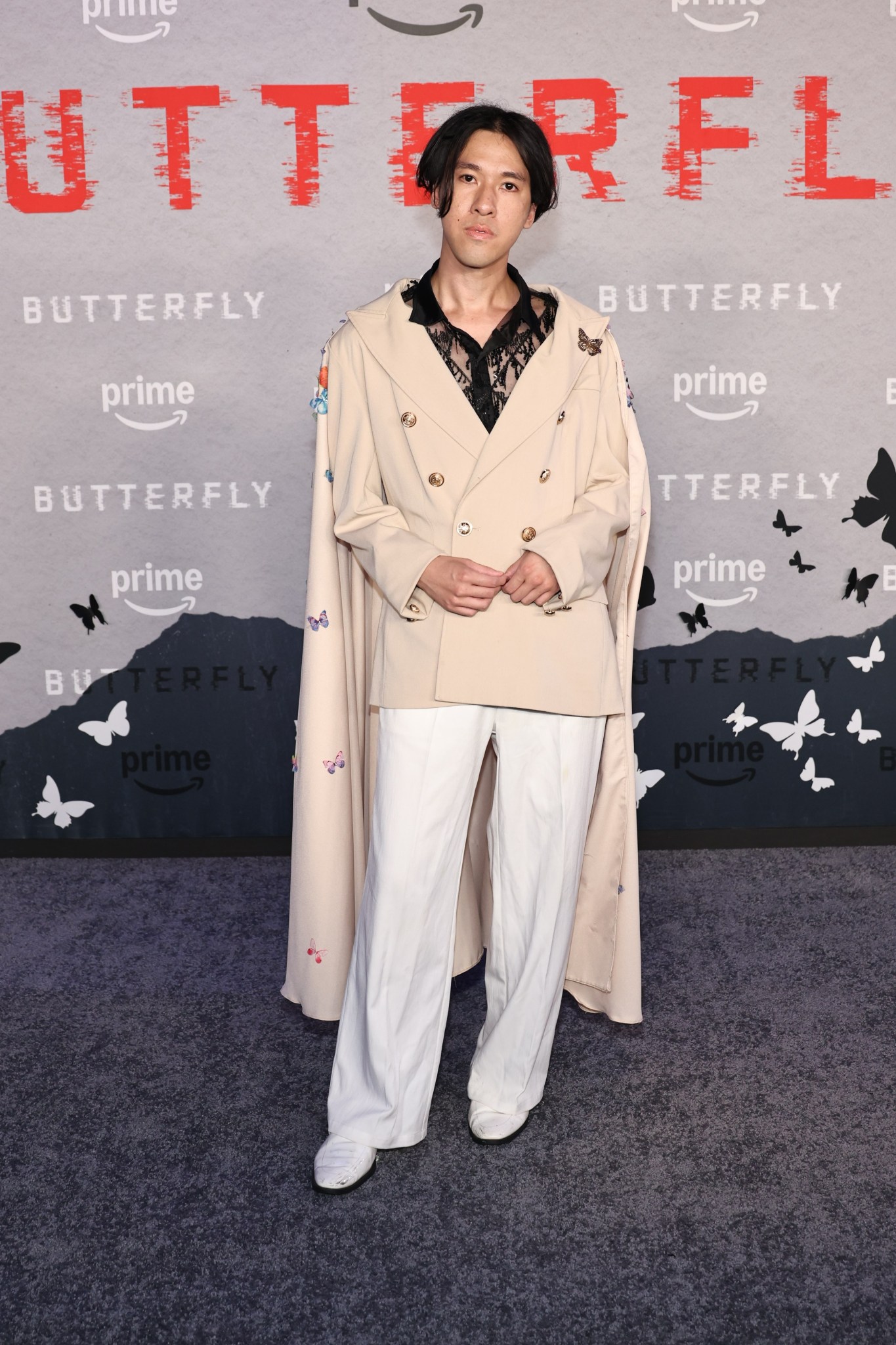 Dave stunned on the carpet in a striking beige/tan jacket featuring a dramatic cape adorned with vibrant, multi-colored butterflies, perfectly complemented by a butterfly metal pin at the front. The design was specifically chosen to symbolize the film’s title and artistic vision, merging high fashion with cinematic inspiration.