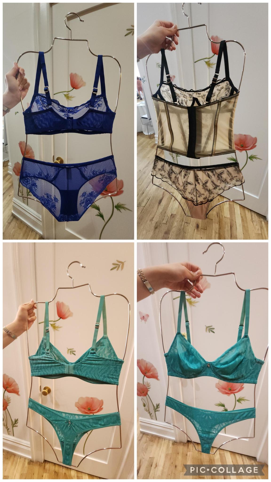 Now a normal but high-quality line of bras and panties to wear everyday with either your casual or work clothes. a made in Malasia collection of unconstructed bras and matching thong or brief panties. These bras have underwires and are lined so your nipples won’t show with matching color mesh. Bras are sized in 30 -38 with cup sizes C – G and fit a fuller bust or females that have breast implants. Priced $85.00 – $90.00. Other matching pieces are a cheeky brief as shown in the upper photos, stretch lace thongs and tee shirts. Panties are sized XS – XL and are priced at $45.00 – $50.00. For some sexiness there is the bustier with underwire but unconstructed cups in black and nude lace and a matching thong panty in the upper right-hand corner. Bras and panties in lots of pretty jewel tone colors. To order, go to WWW.AMOUR-DAGNETTE.COM.