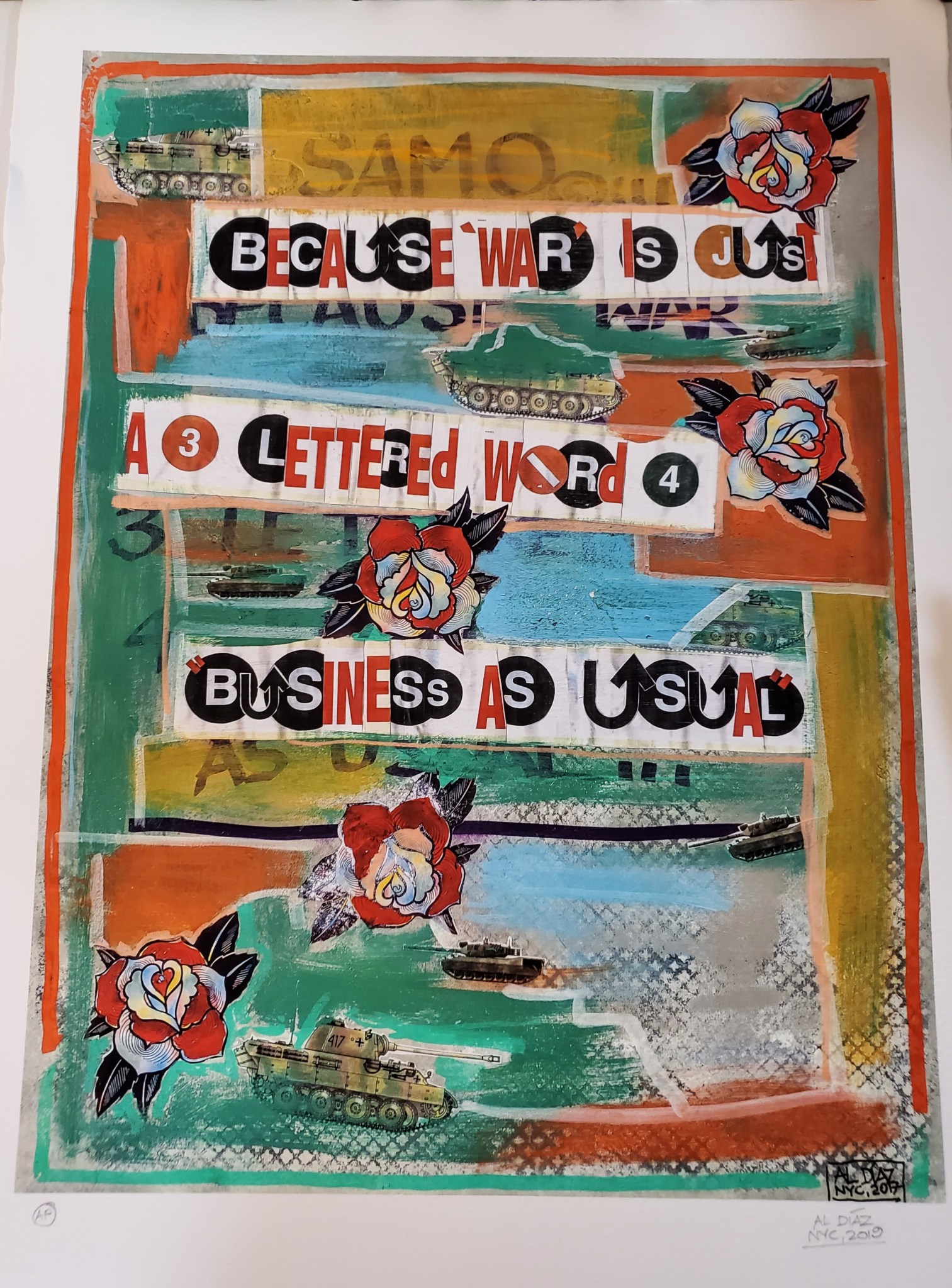 In the middle of a garden, roses and florals all aligned by design, there’s the audacity of an army tank, and it’s not just one. “Because War…”, this profound piece by Al Diaz constructed on Giclee Print AP, stresses the apparent war happening in the world while we live in peace. War is also a business that involves conflict, weapons, and tragedy. But in this Al Diaz piece, his view of War is more than the obvious, just simply business as usual.