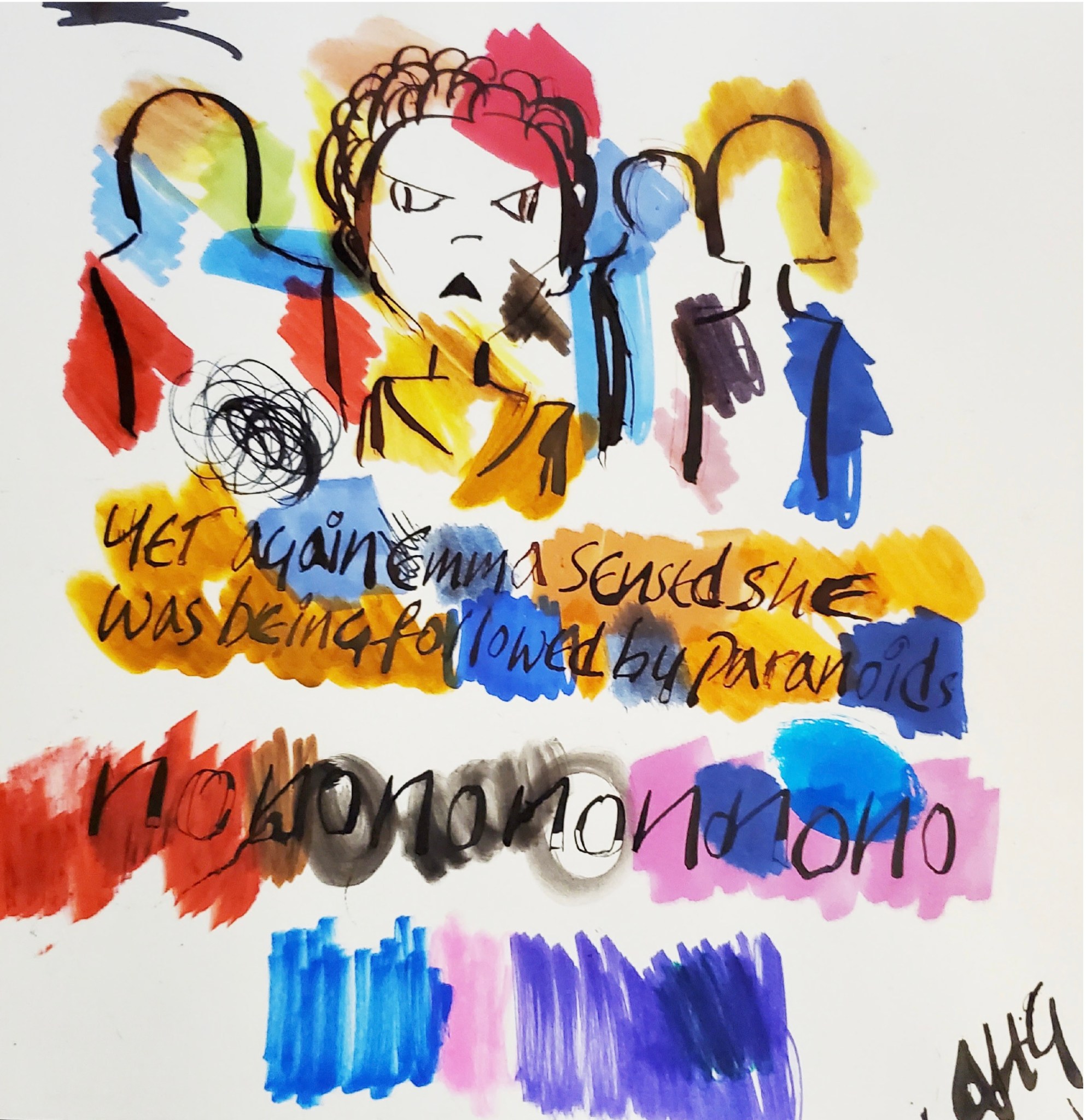 No one can count the amount of times that paranoia follows each step we take from wake up to sleep, it’s evident here in New York City. Albeit, no other city outside NYC has any legit excuse for paranoia, it’s still a factor, it can be evident even in people. At that point, people are not paranoia, they’re paranoids. That’s what “Emma” is feeling in Anthony Haden-Guest’s Splatoon Series as ink and marker on paper sense Emma feeling like paranoids are following her again.