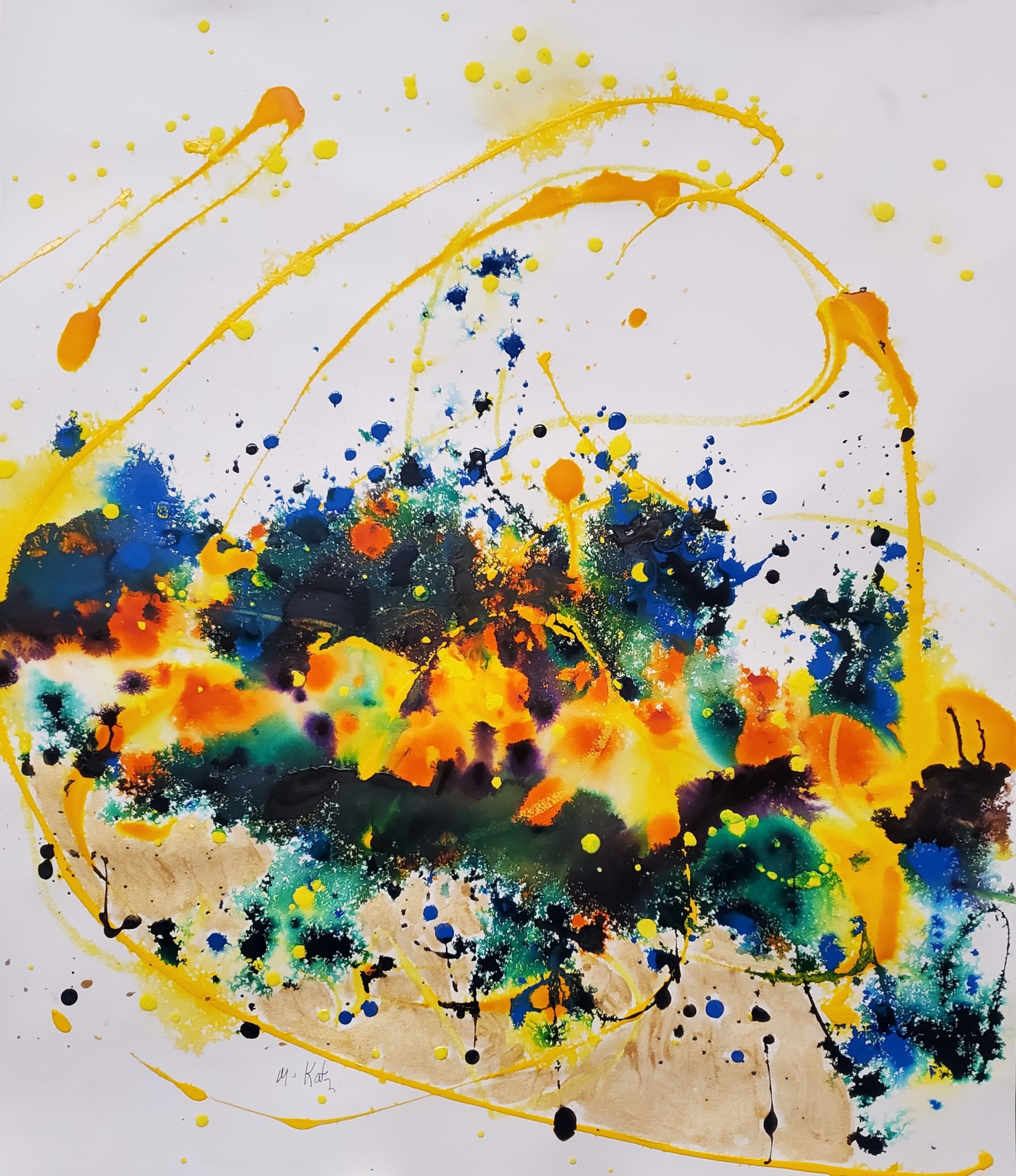 Mixed media is at play here with this “Sun Shower” of dancing streams as if it were rain, shooting into the sky creating arches of yellow. The origins of this shower are a mix of black, blue, green, purple, and red which normally generates rain. But when the sun meets storm clouds moving it, this cold front opens up the sun to break through, causing in real life a rainbow to take place. This is what a typical hot summer afternoon feels like, high heat and heavy winds followed by diminished sunlight before a severe thunderstorm occurs.