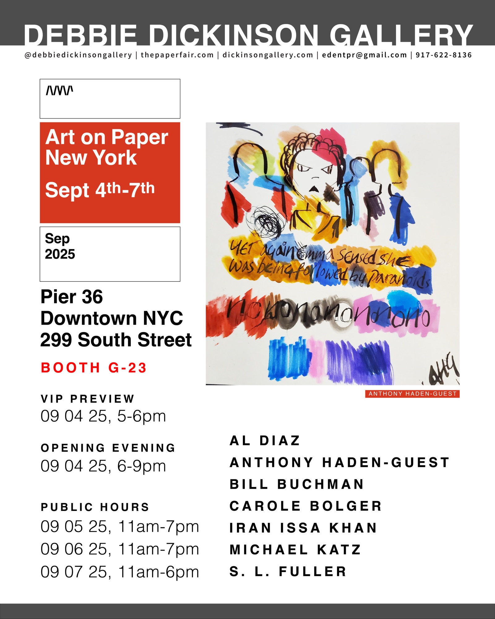 Debbie Dickinson, the coveted art gallery curator, will showcase her latest collection of artists at Art On Paper: New York, beginning this Thursday, September 4. The 4-day exhibit will be at Pier 36 in downtown Manhattan here in New York City where “Convergence”, will focus on the evolution of each artist who will take us through their journey of struggle and triumph. The Debbie Dickinson Gallery of “Convergence” artists will include Carole Bolger, S.L. Fuller, Bill Buchman, Iran Issa Khan, Al Diaz, Anthony Haden-Guest, and Michael Katz.