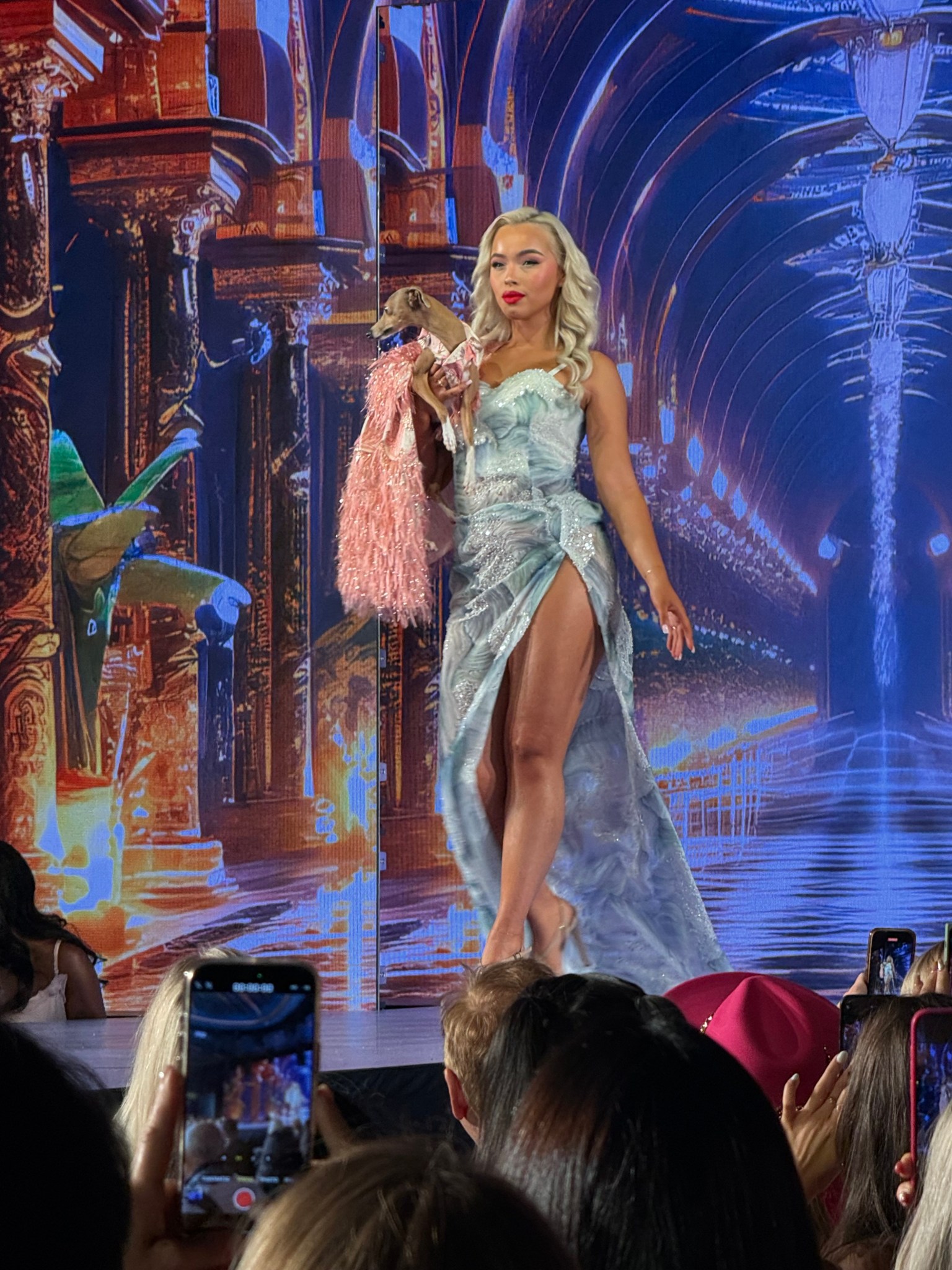 Some of DPL’s favorites were glittery floral like shapes on the models that went with cute poodle florals to complement green and yellow offered, plus purple joining in. A favorite contrast included model’s cloudy sky blue sequin paired with baby pink sequins designed like Pom-Poms.