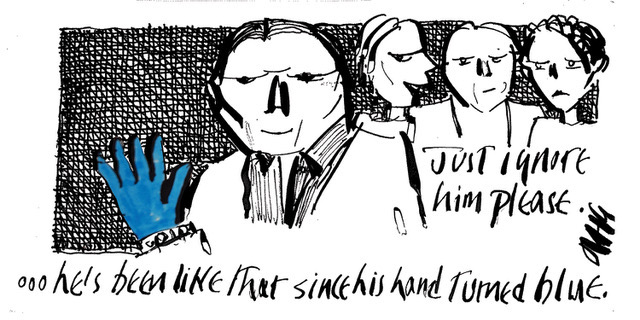 Sometimes one’s moment of life-threatening peril is super-evident that you have to call for help, but we fail to address what happens thereafter. There’s not always physical evidence as your mood turns dark, but then someone figures it out and just passes it off. Anthony cleverly draws himself holding up a blue hand where others wonder what the heck is going on with the discolored body part. But quickly the words of 3 others behind him being “Just Ignore Him Please… his he’s been like that since his hand turned blue”. Happily acknowledging the blue hand by simply displaying it, words quickly without questioning what’s even going on spell out one’s ignorance.