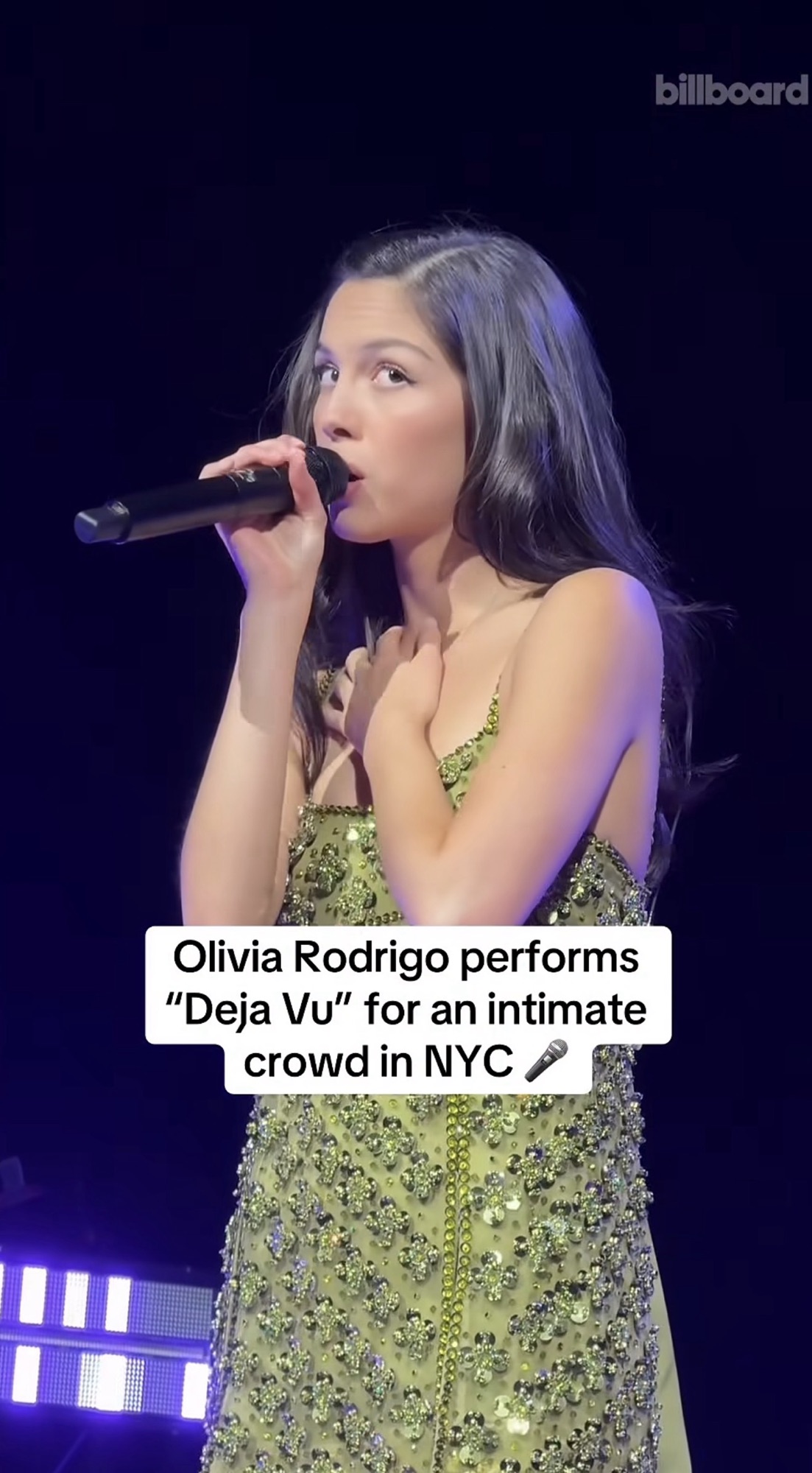 Olivia Rodrigo made the Upper East Side of Manhattan a bit more richly tonight as Olivia performed a special concert for American Express Platinum members at Park Armory on 643 Park Avenue here in New York City. Olivia in this reel by Billboard sang one of her most spellbinding ballads that gave you “Deja Vu”. Olivia also made green a new favorite color for her everlasting LIVVIE fans as Olivia wore a lime-green sequin spaghetti strap dress with all gems and stones shaped in what appears to be four-leaf clovers also gemmed in green. Both Olivia Rodrigo and AMEX Platinum have been touting this surprise concert for the last few days since Monday.