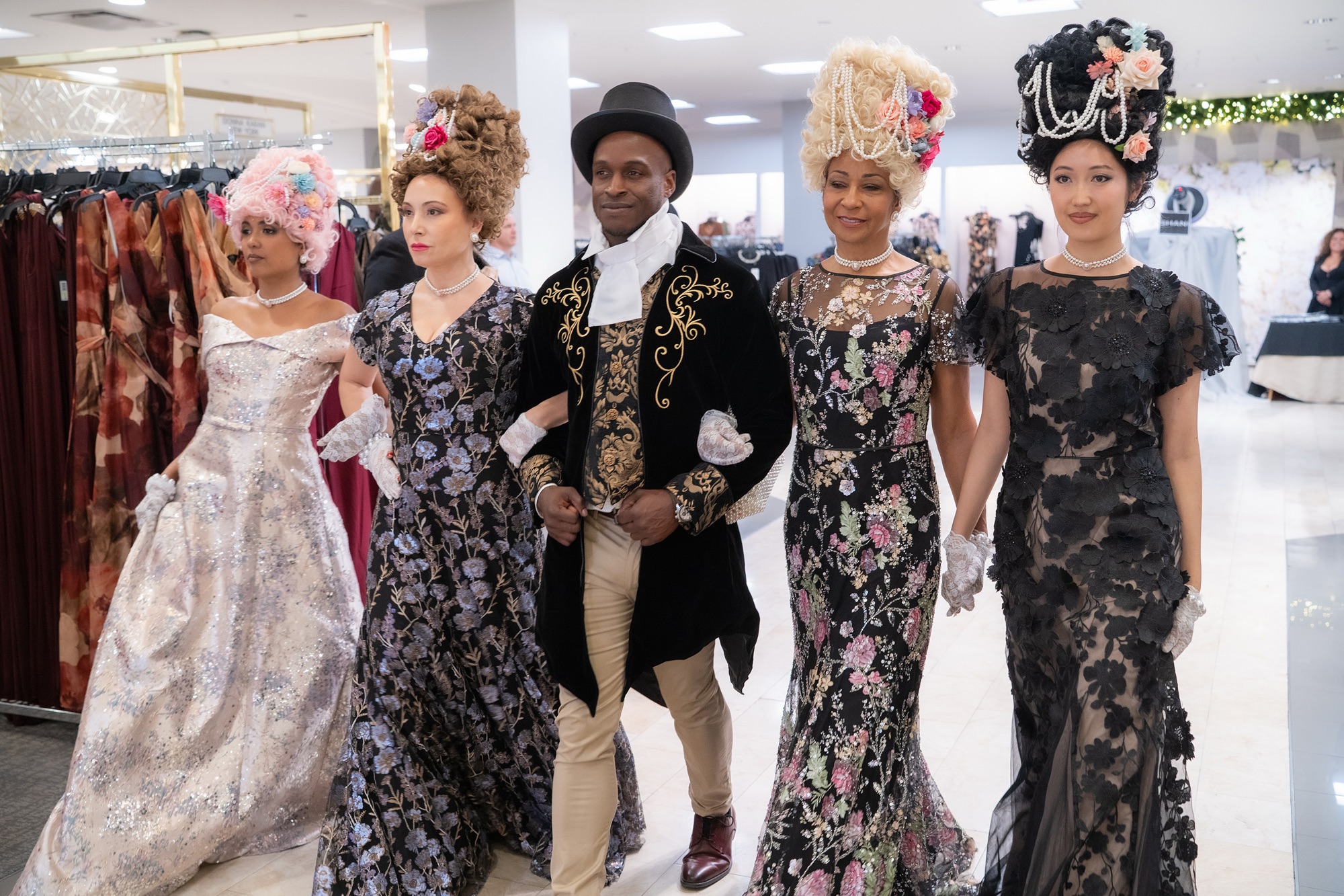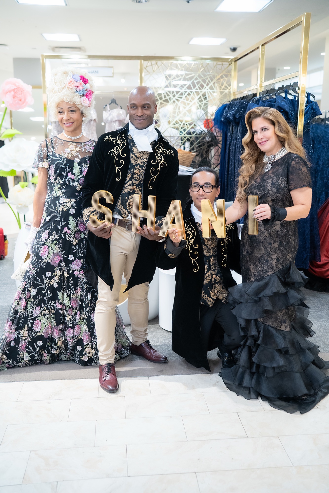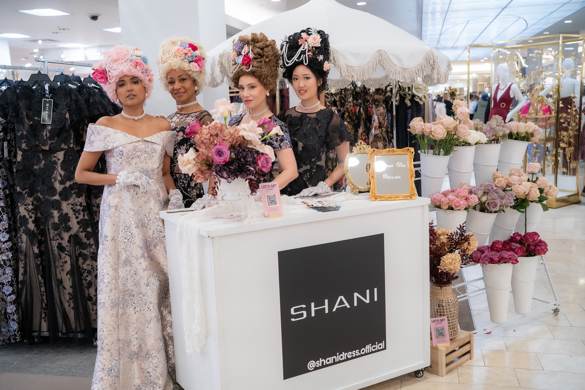 Shani Grosz sought out inspiration from old English balls where Shani utilized floral details, intricate beading, and appliqué work. Along with the Regency-era of old English tea, women in modern day will also be very tickled by the feel of the white-hot Netflix hit, “Bridgerton”. A tremendously interesting note is “Bridgerton” aligns with Shani Grosz’s High Tea Activation because the Netflix series added modern-day elements to its storyline.