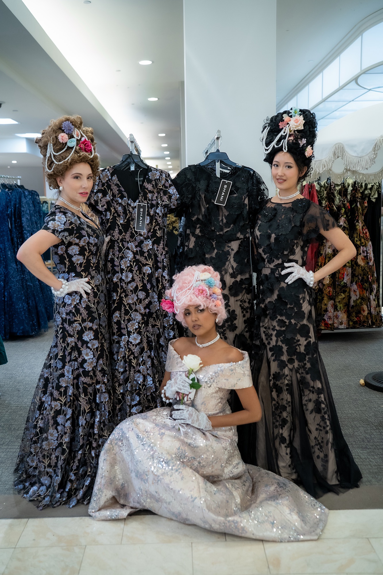 Shani Grosz’s favorite colors in her High Tea collection are pink, white, black, and dark blue. Shani’s bold color choices go hand in hand with not only florals, but sequin, sheer, and gem detail stitched onto each gown. Floral headpieces also complement “A Magical High Tea Activation” as part of the ole English experience where no tech device existed in its day.
