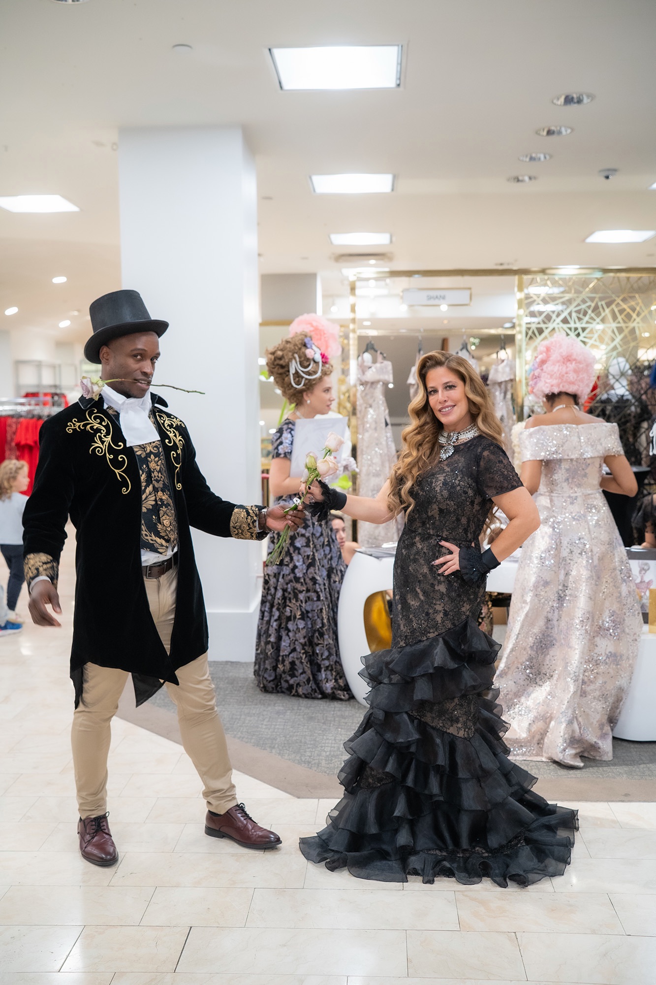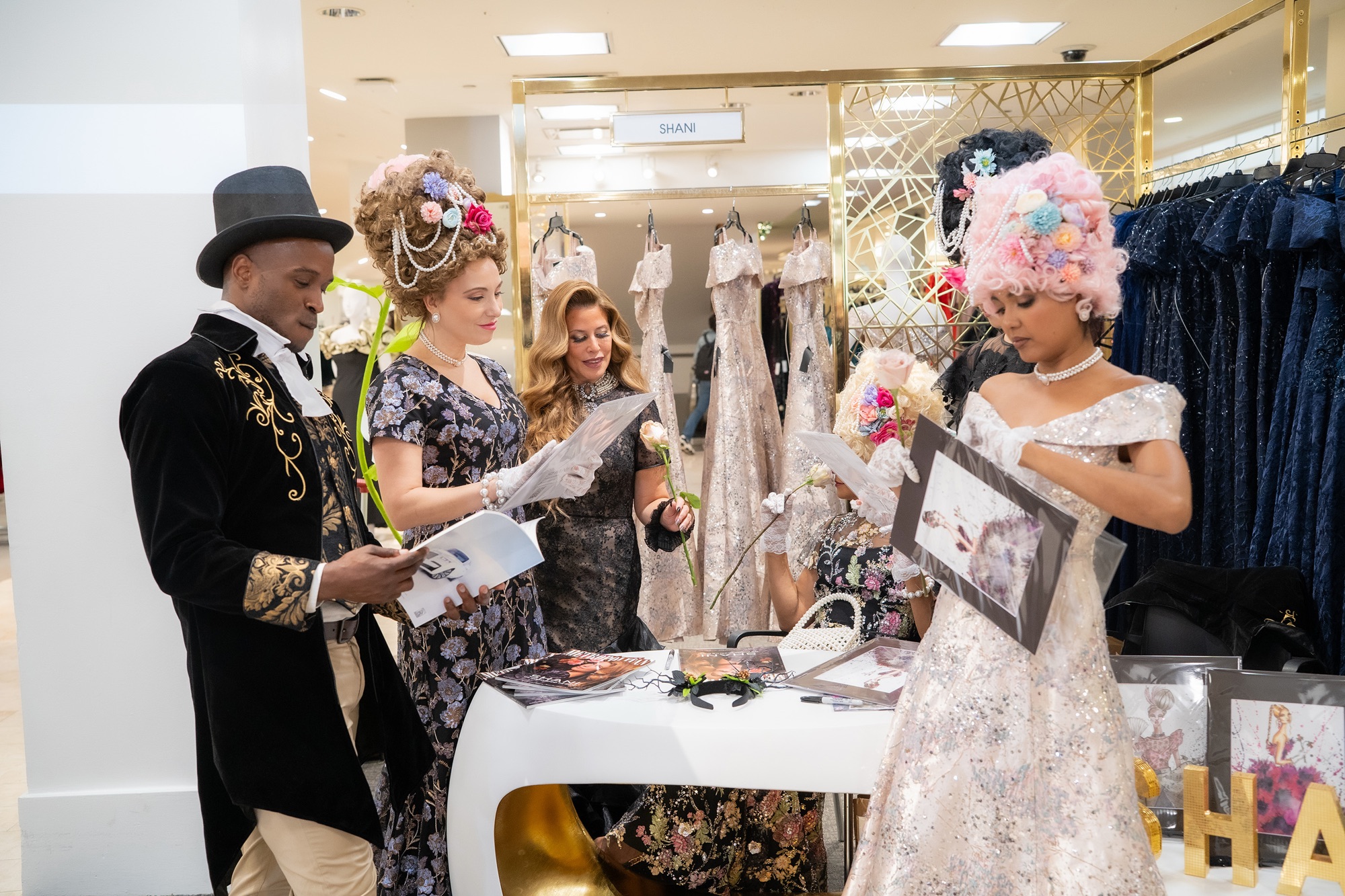 Shani Grosz, a true New York City fashion designer who elevates fashion to three dimensional levels, took to Macy’s in Herald Square last Saturday here in NYC. Shani took on Macy’s iconic space to create “A Magical English High Tea Activation” that brought to life the Regency-era of old England centuries ago. Along with Shani’s prolific, illuminating, and vivid talent for painting based on her fashion, Shani brought her Ole’ English gowns to the showroom floor for an immersive experience. Shani reimagined an English High Tea parlor that took the typical display to multidimensional recreations here in modern day Manhattan at Macy’s Herald Square.