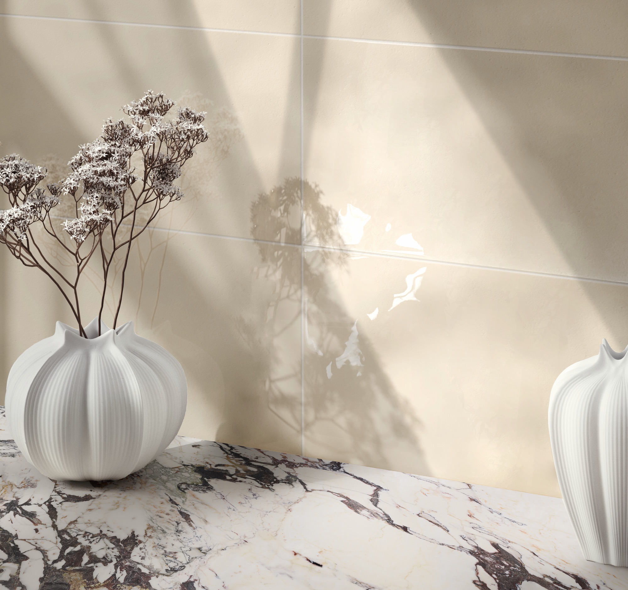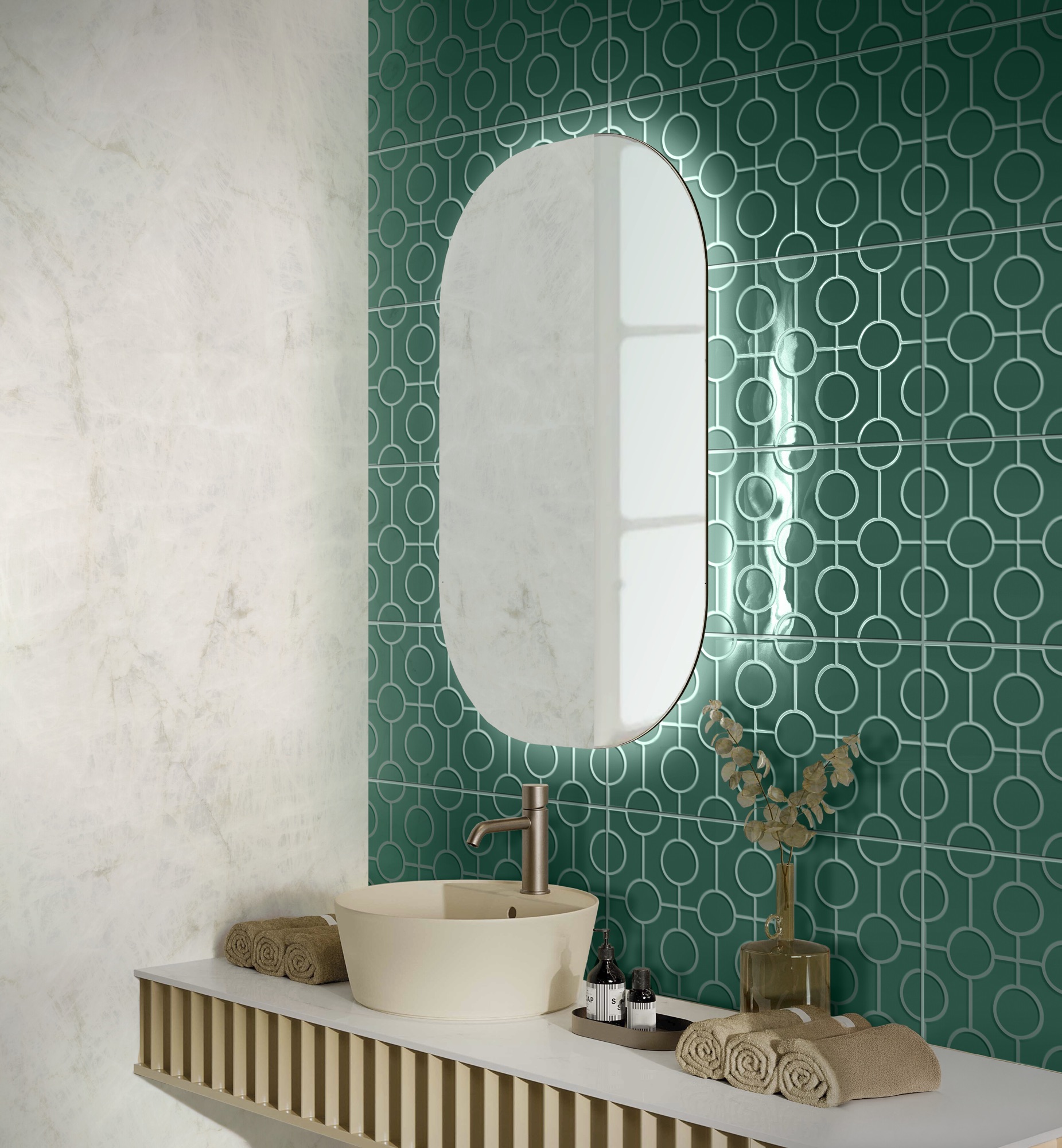“This vibrant glazed ceramic collection features rich textures and a gorgeous spectrum of saturated hues, designed to bring energy and depth to backsplashes, accent walls, and standout design moments,” continues Grilli. “Luminique can uplift a space throughsubtlety with the natural light beige and bright white tile shades or it can be a bold statement with the deep green and navy blue. Whether adding a single signature color or mixing for a multicolored installation, Luminique transforms ordinary walls into extraordinary expressions of style.”