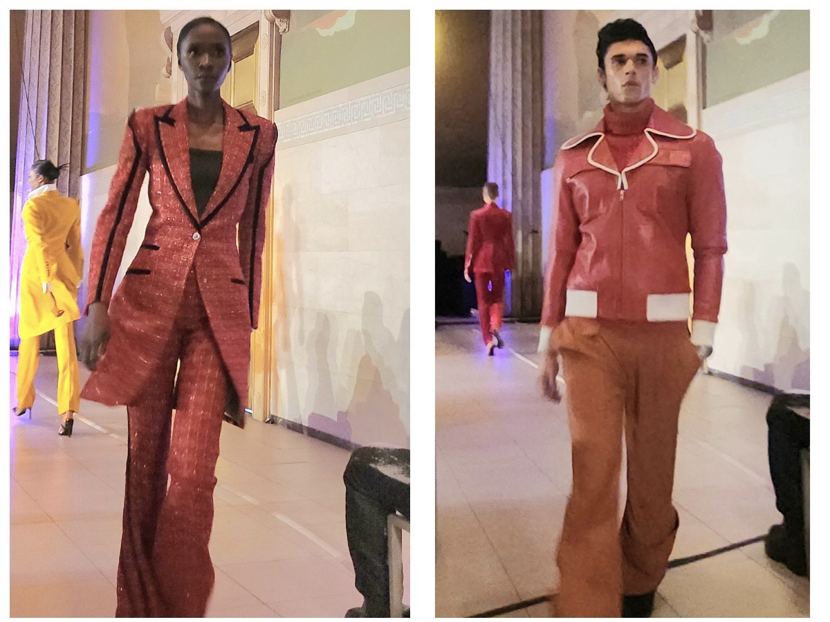 I have been going to Malan’s NYFW shows and presentations for over ten years now and he never disappoints me with his tailored collection for men and women. His clothes are timeless and of the best quality fabrics. He used lots of patient leather in black or red in coats for women which can be worn day or evening. Bell bottom pants ruled but with lots of strappy details on the bell part of the pants making them look different than other designer pants. Men’s bell bottoms were worn with heavy tunic length sweaters that had rolled up sleeves or 1970s inspired tomato red leather jackets with ivory piping around the lapels, cuffs and around the hem. Women’s bell bottoms came in a tomato red /cream plaid boucle with a matching a retro 1970s fitted coat trimmed with black piping that is perfect for fall weather with a turtleneck underneath. His coats were very fitted with wide labels. The bright yellow trench coat for guys is the perfect city coat for all seasons.
