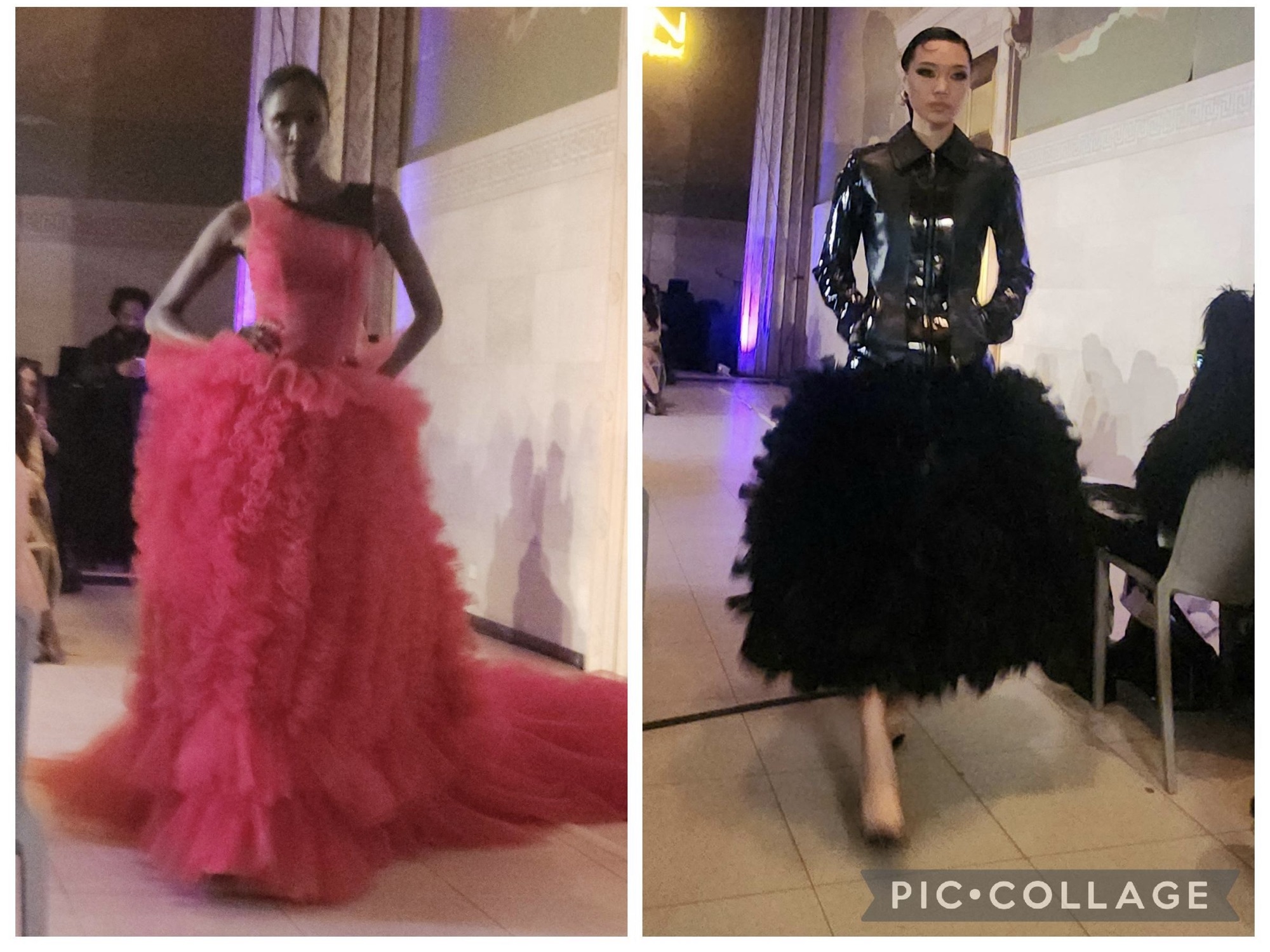 Now, for his show stopping evening dresses that you won’t find yourself coming or going in. The one I loved the best was a 1950s influenced style with a red full skirt and a white bustier top but what made the dress unique was the white peplum over the top of the skirt. His gowns were sensational in a red tulle ruffled skirt that had an asymmetrical sleeveless top attached to it. You will make a grand entrance and exit in the black coque feather floor length coat. The grand finale model had on a white tulle (many layers) circle skirt supported by a hoop skirt like the ladies wore in the 1800s that swished on the floor as she walked down the runway. The bodice of the gown was black, off the shoulder and tight fitting. Many of the evening style dresses and gowns were topped off by fascinators by Mimi Monroe which completed the look.