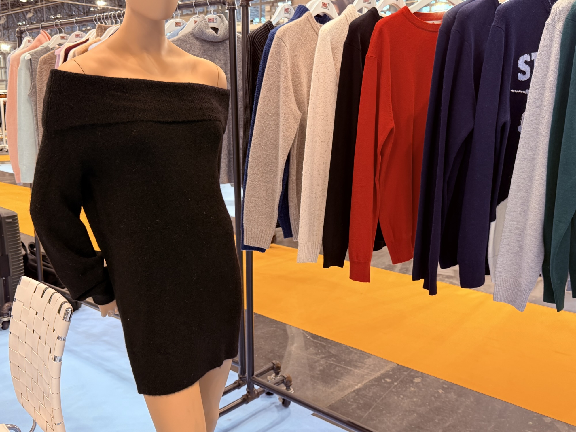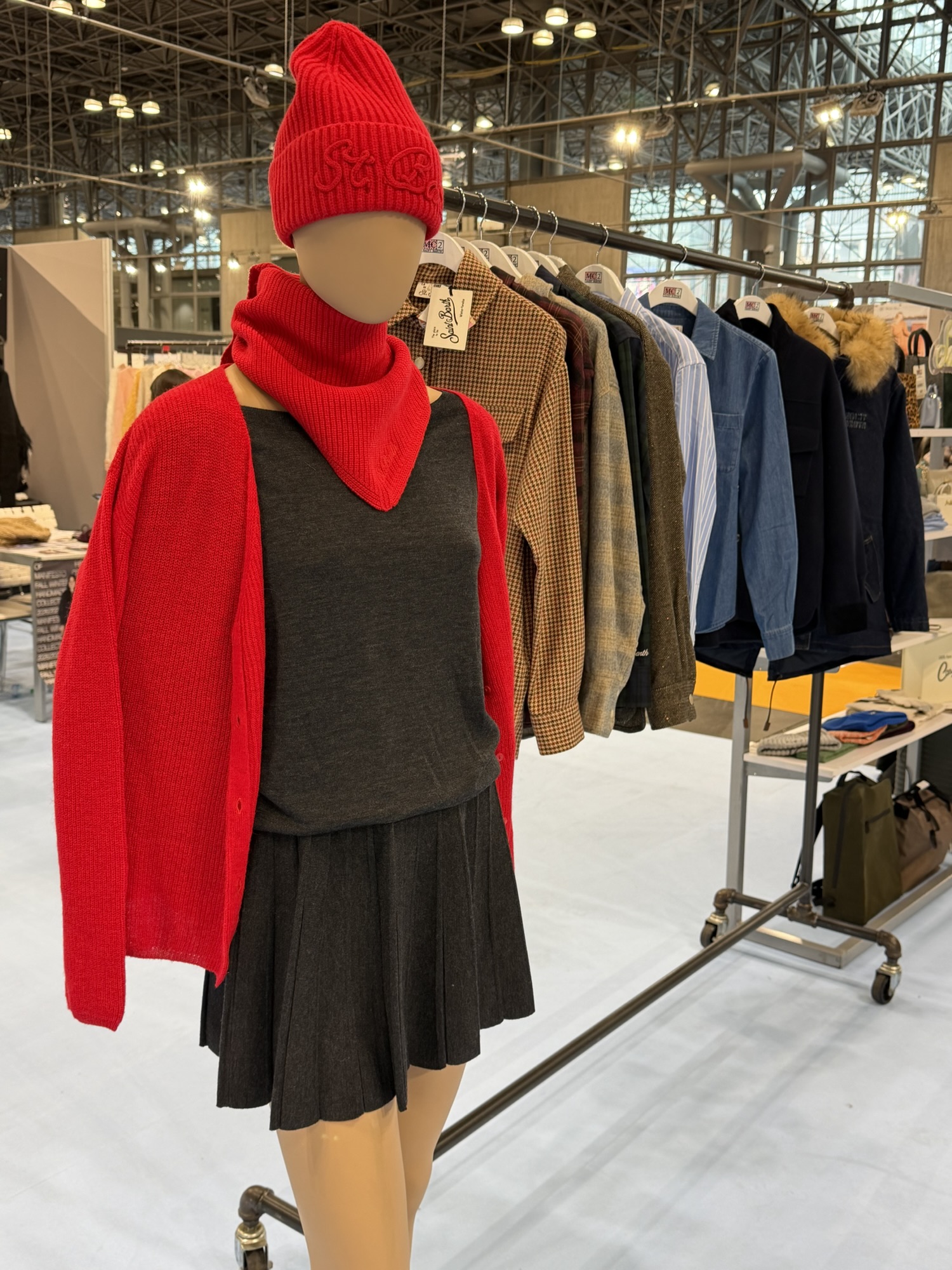 For the women’s collection, ST. BARTH is focusing on this new capsule of knitwear with the French taste. So they are very, very soft, thin sweaters, with pastel colors. They are very feminine, very, very light, but at the same time, very warm. DANIEL PLUS LAUREN certainly loves the look of charcoal top and skirt paired with pops of color in red with hat, scarf, and knit jacket. ST. BARTH has its own take on the little black dress going off the shoulder along with turtlenecks in blue and green variants.