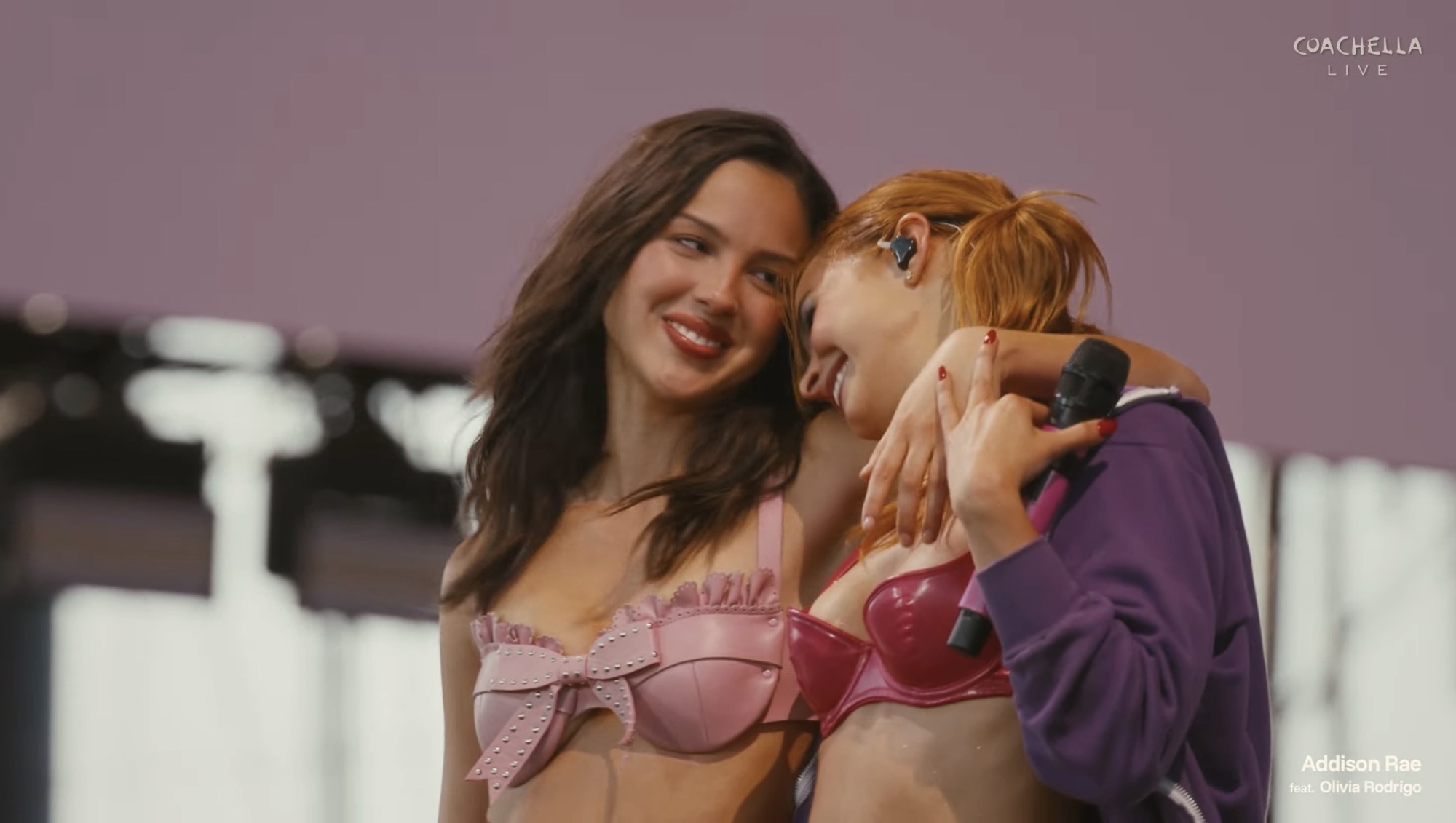 Olivia Rodrigo certainly made a big splash tonight at Coachella where Olivia popped up during Addison Rae’s set. Addison went about her red leather bikini clad business as Olivia popped up at top stage right in pink crop top and blue jeans. Olivia mingled in singing one of Addison’s songs accompanied by a whole group of dancers. Then Addison says she could “Drop Dead” which obviously was a lead into Olivia performing the “You Seem Pretty Sad For A Girl In Love” 1st and lead single for the first time live.